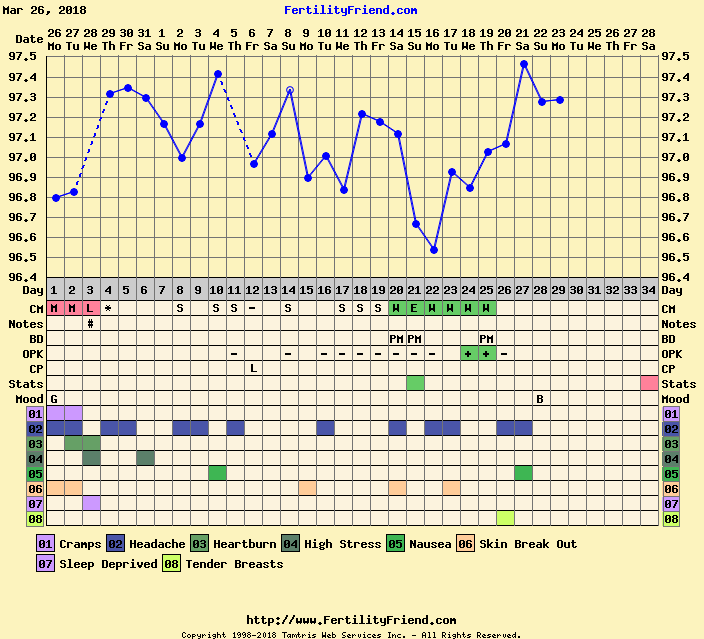 In Nov, I had gotten 2 consecutive + OPK. FF pined O for the day of the second so after gaining that info, I switched to just taking 1 +. I was unable to do 1 yesterday as we were at my parents all day but had I been home I probably would have. Just for kicks I did another on lunch today and it was -. My cm has become watery again this afternoon and I'm cramping quite a bit. We are going to HIO again tonight just for safe measure.