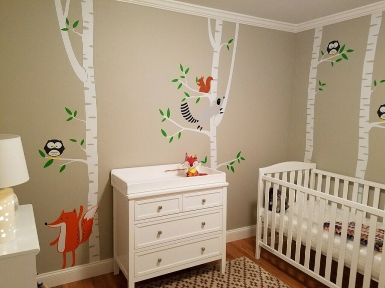 Also, I promised pictures of our nursery about a month ago or so, and we finished it (as much as we can without the chair that's coming in a couple weeks and the accessories on our registry). So here you go! (Vinyl decals from Etsy).