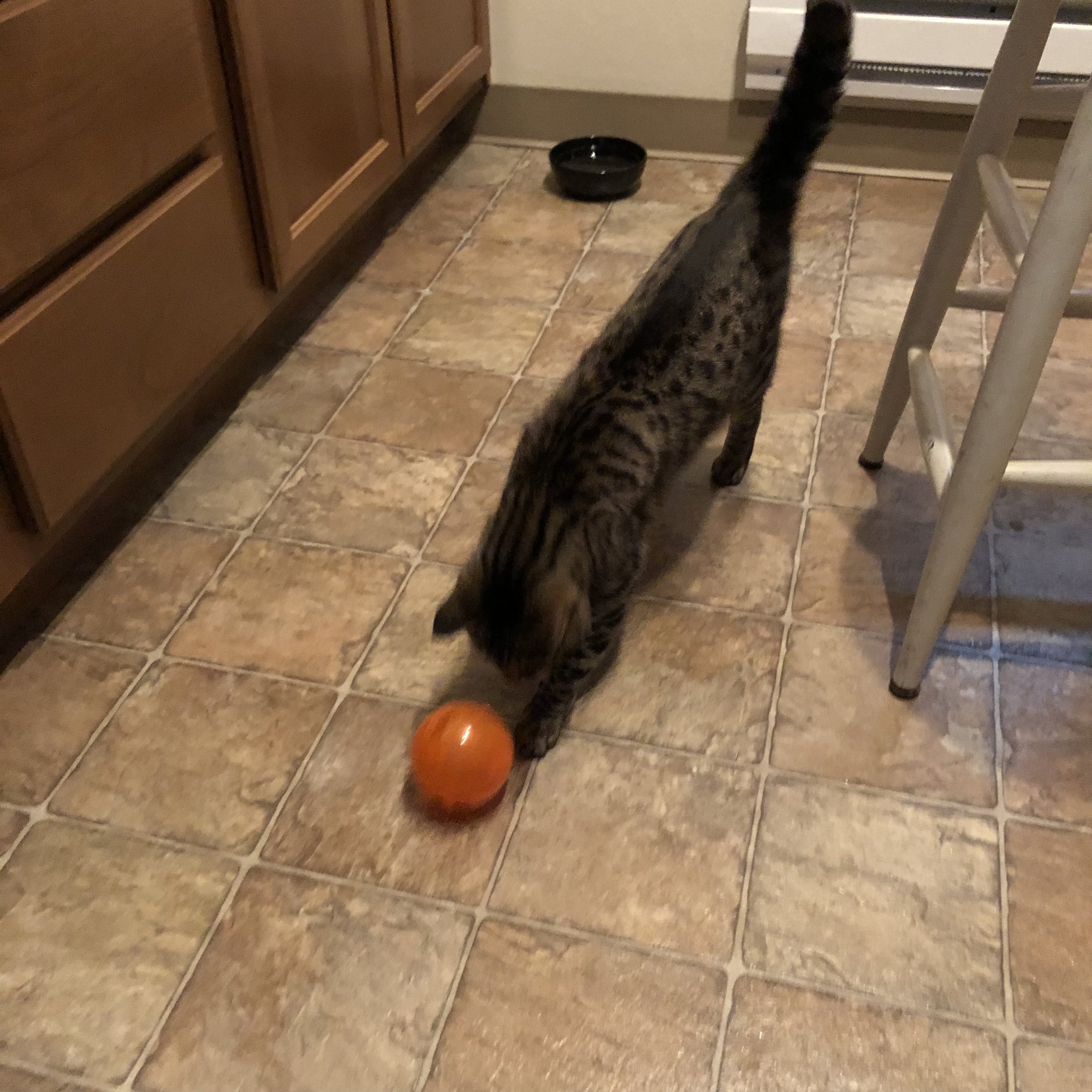 @CecilB93 there are a lot of helpful lists online that review cat food brands and some compare cans, companies etc. It depends on how in-the-weeds you want to get with it- the protein, the additives, the company (history of recalls for example), other ingredients, how easy it is to find in stores, etc. For a healthy cat, I’d start with picking a can that has meat listed as one of the top three ingredients (vs a grain first, or a meat by-product). It might just say the name of the animal; “chicken” for example. There are a couple of options for slowing down eating, one is to put the cats food on a plate, wet or dry (what we do). Another idea to get cats to be more active/eat slower is to put the kibble in a food dispensing ball. Photo example of my cat and her “treat” ball in spoiler. Sometimes it can be hard to get a cat to eat canned food if they are used to only having dry food. Offer a bit of wet food at meals and the cans can be kept in the fridge for a couple of days. (Life hack- frosting lids cover regular size cat food cans well)