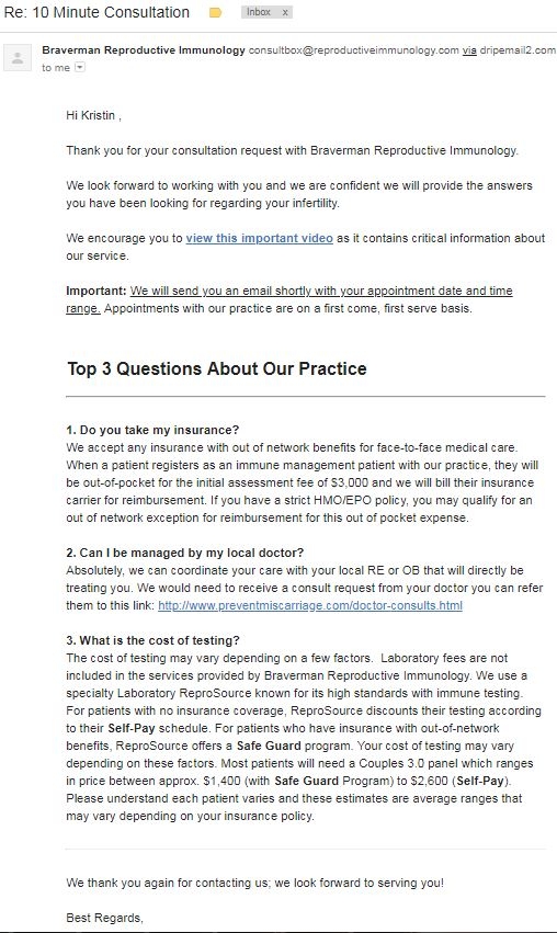 So in other news, I had posted after my surgery on a facebook endo board I joined. Dr. Braverman (who apparently is in the group?!) commented on my post and encouraged me to make an appointment with him, because multiple losses, declining in gestation (which mine sorta have, though not exactly), is very indicative of immune issues. So I went ahead and put in a request for a consult. I got this email: