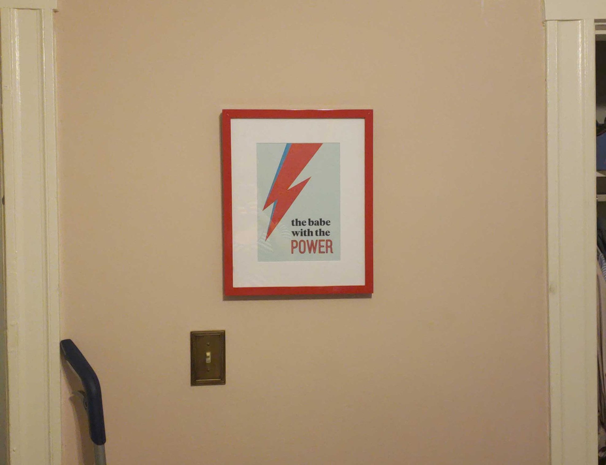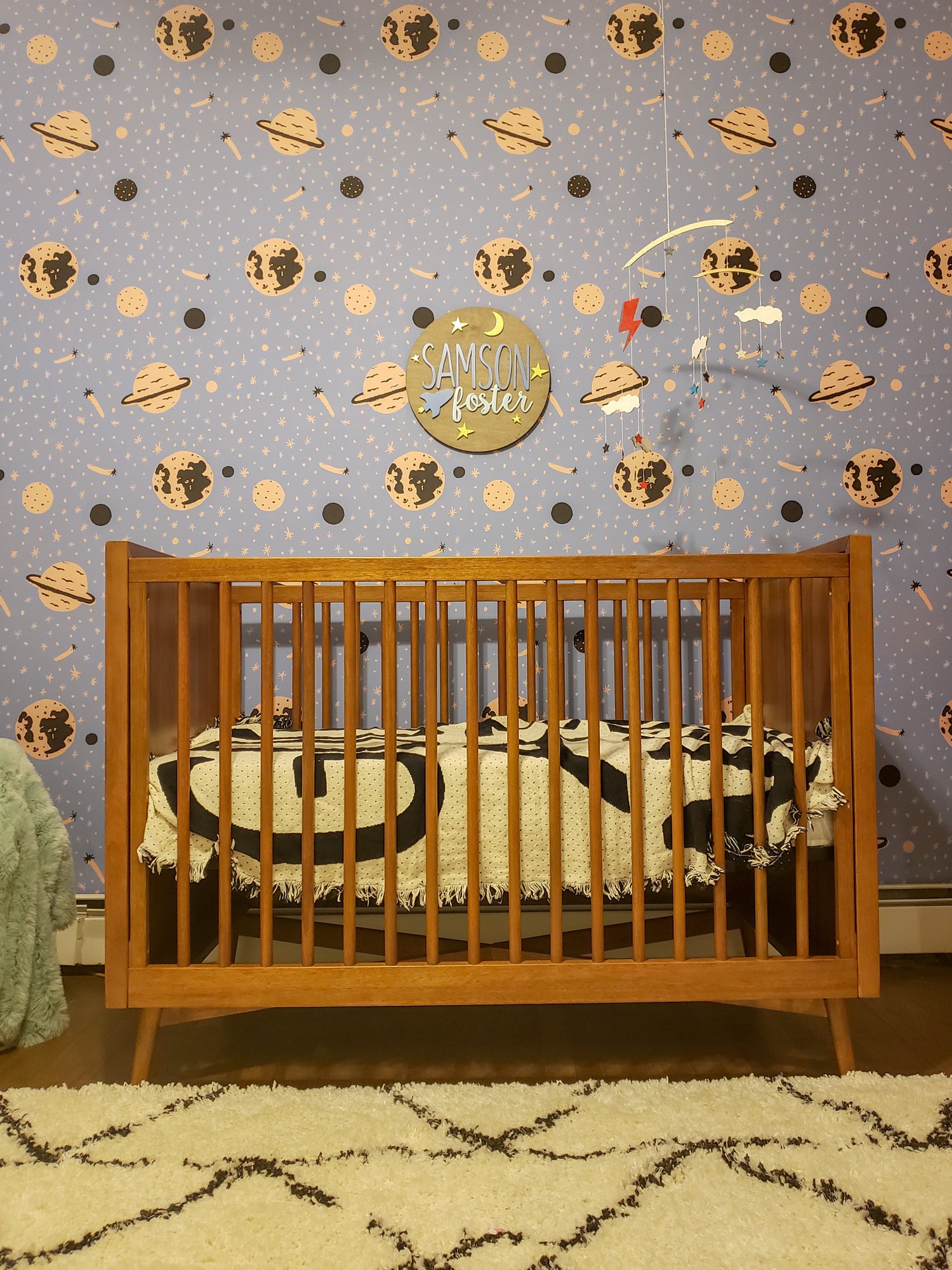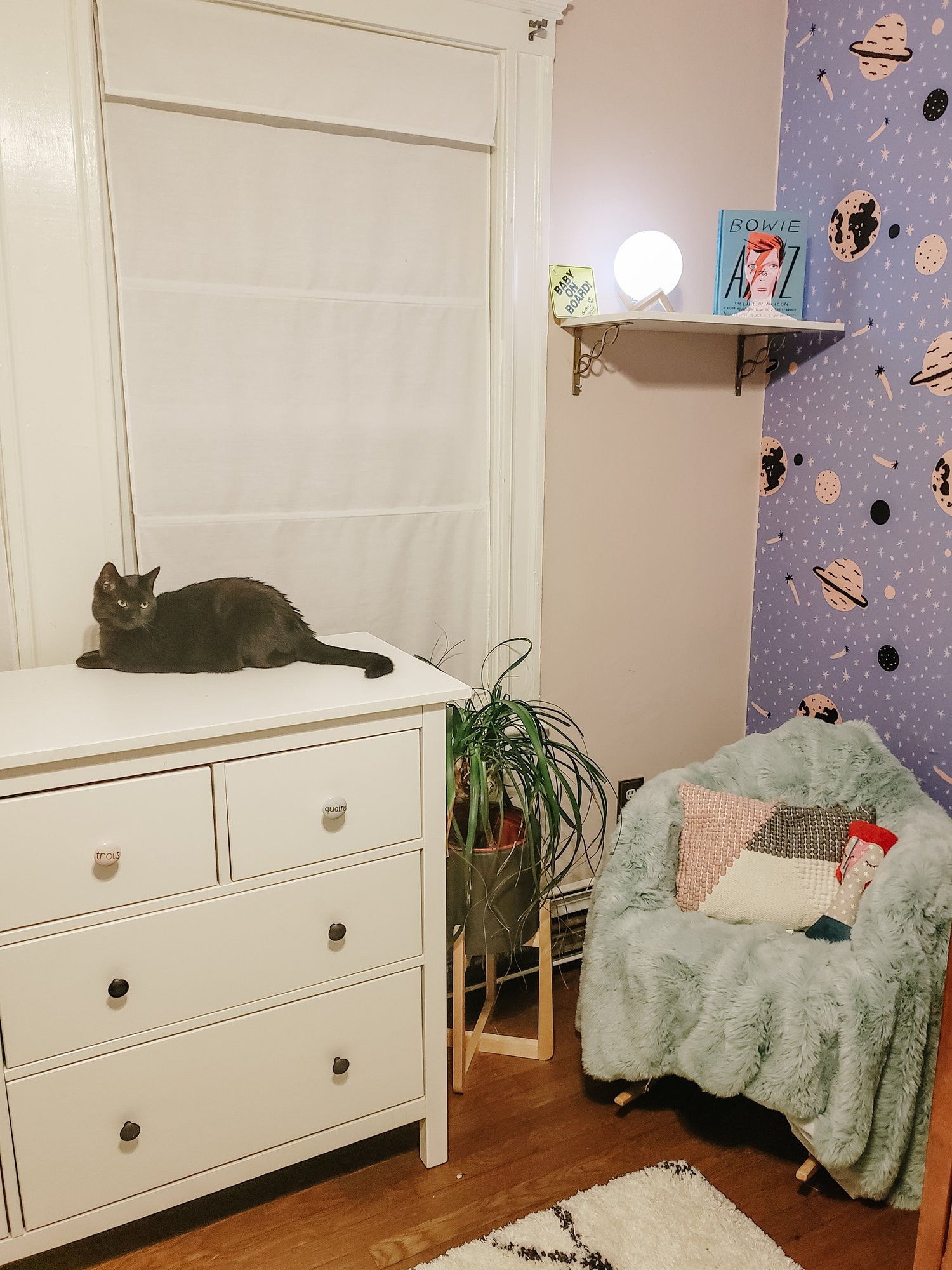 I made some nursery progress today! We finally finished putting up the accent wall wallpaper. Switched out some knobs on our hemnes dresser for some cute anthropologie ones. We also committed to our final furniture placement so we could finally hang our art and mobile that have been sitting around for months. I was really close to pulling the trigger on a fancy glider but I couldn't justify spending so much right now so I just moved a cheap plastic rocking chair we already own in there and covered it with one of our big luxurious blankets. I figure if it doesn't work out we can always buy one later but I'll make do with what I have for now. I also obviously will not be keeping that blanket in the crib but it says "good at naps" (my husband bought it for me years ago lol) so I figured I'd let that message float around the room until I actually have some sheets to put on... I'm so happy with how my little David bowie/starman nursery is coming along! I cant wait for my baby shower next weekend so I can really finish it off!