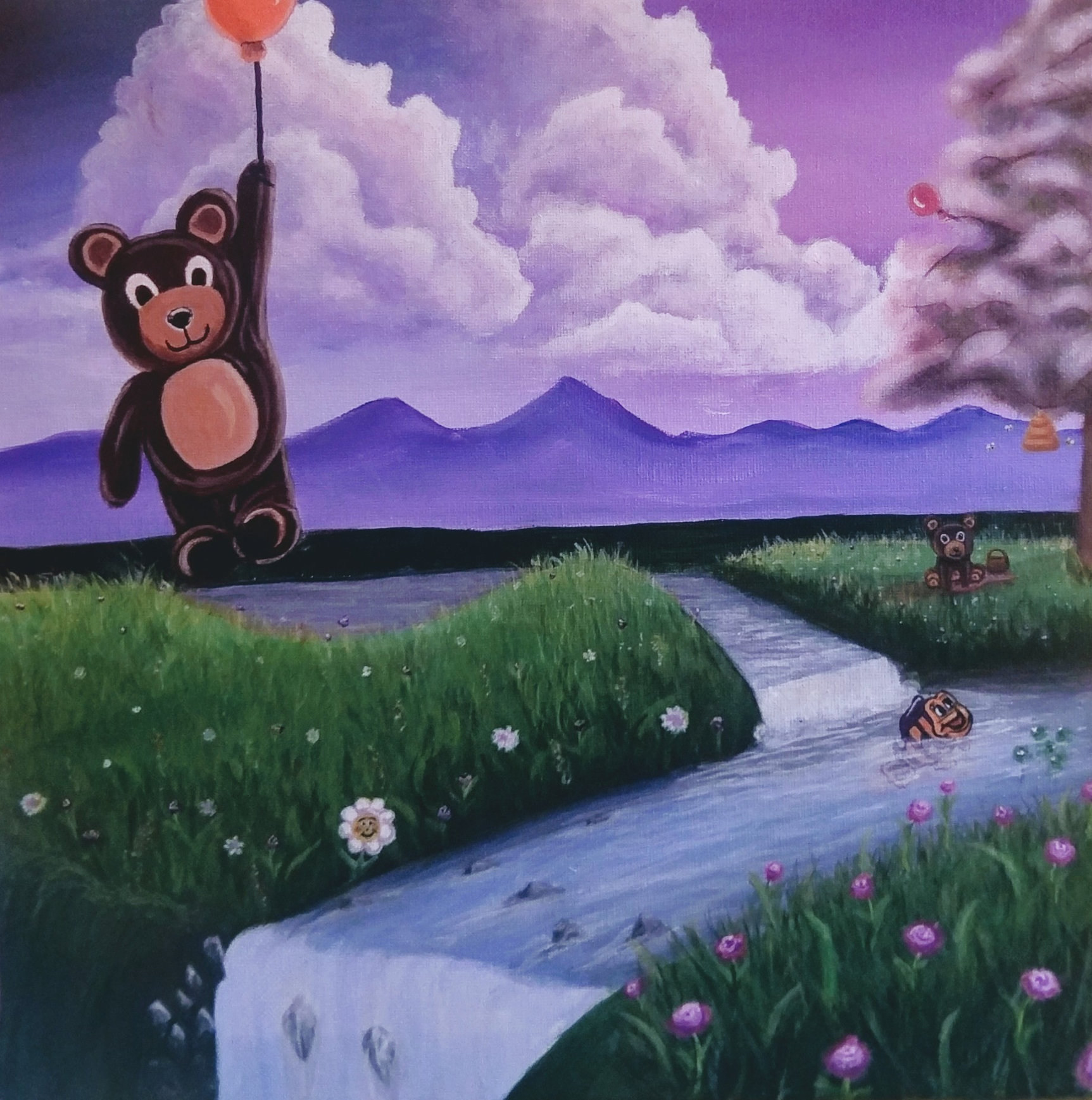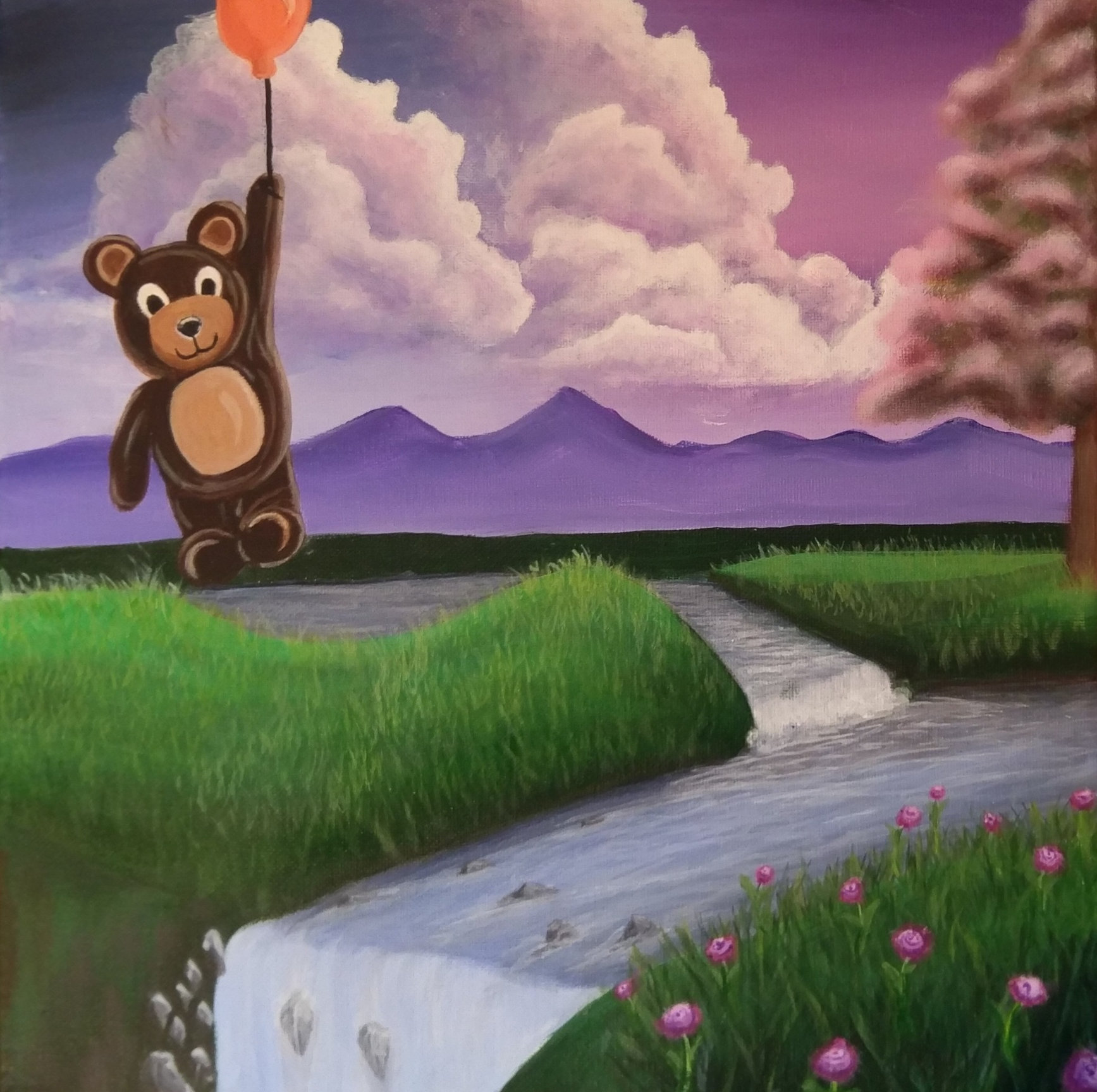 I'm working on this painting for baby's room. I've since added a cartoon fish in the water and a balloon caught in the tree. Just a few more details to fix up, a teddy bear picnic to add, and it'll be finished.