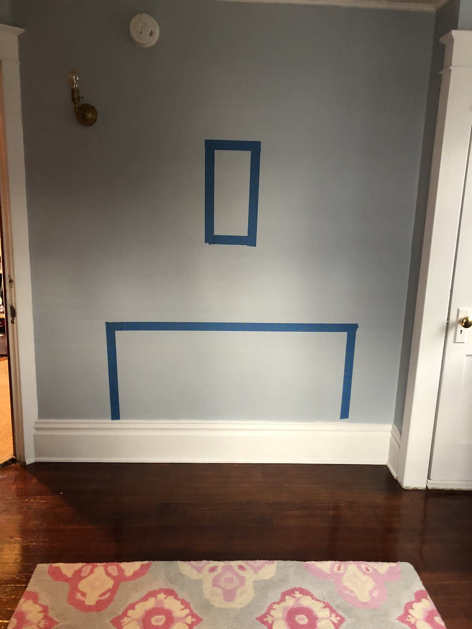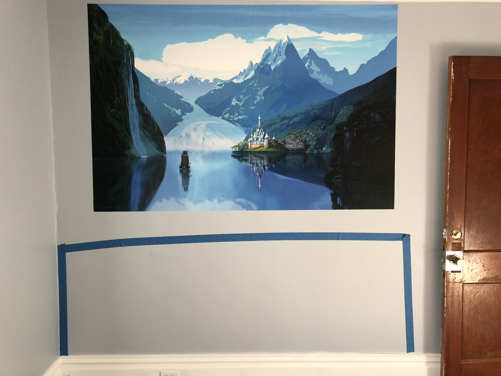 Got her Arendelle decal up. Taped out where the daybed, dresser and other piece of art will go. Still debating what to put above her crib. We have plaster walls so hanging anything is a nightmare.