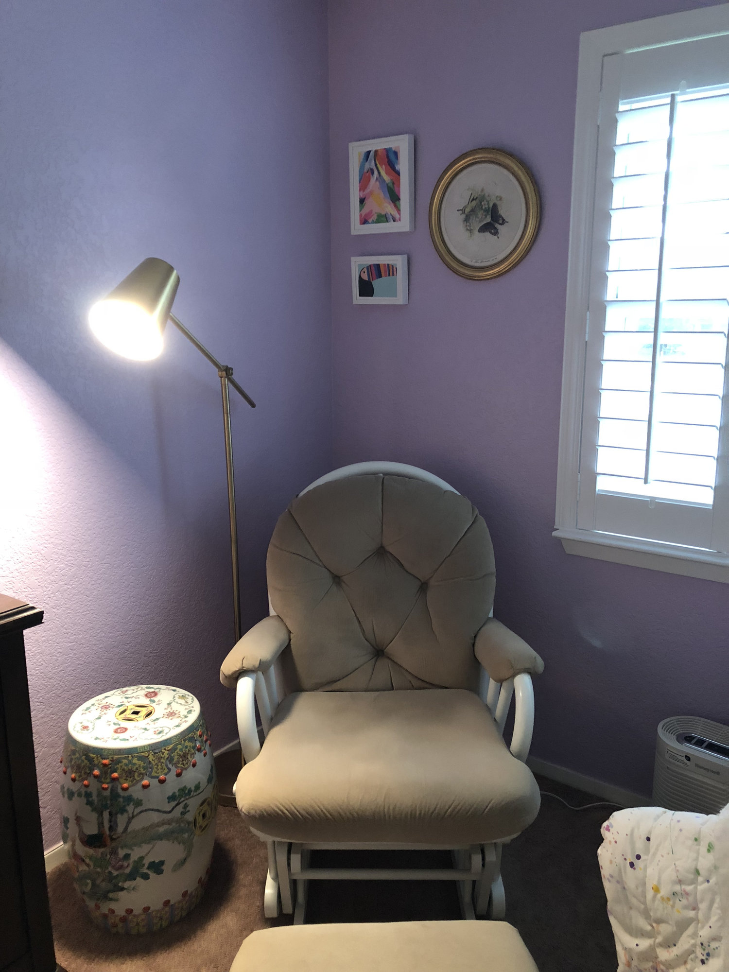 I am not finished by any means but I am happy with this corner lol. We had the shutters installed a couple of weeks ago which I am very happy with! They will really help with nap time and mornings as this room gets a lot of natural light. My daughters name will be Iris so we went with a lavender paint. I am waiting on a monogrammed pillow to put on the rocker and still waiting on bedding to arrive. Not complete but getting there!