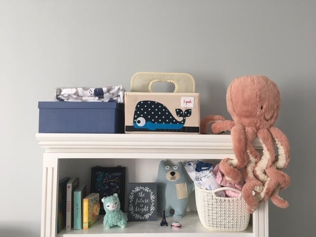 Our "subtle" nautical theme is coming along. I ordered an arm online to put the mobile up since the ceilings are too high to reach. And I got a few little plastic knit baskets at Marshall's for doodads- one of swaddles and one of hats/booties/socks. Happy with the colors and I often go in a look at it because it reminds me this is real