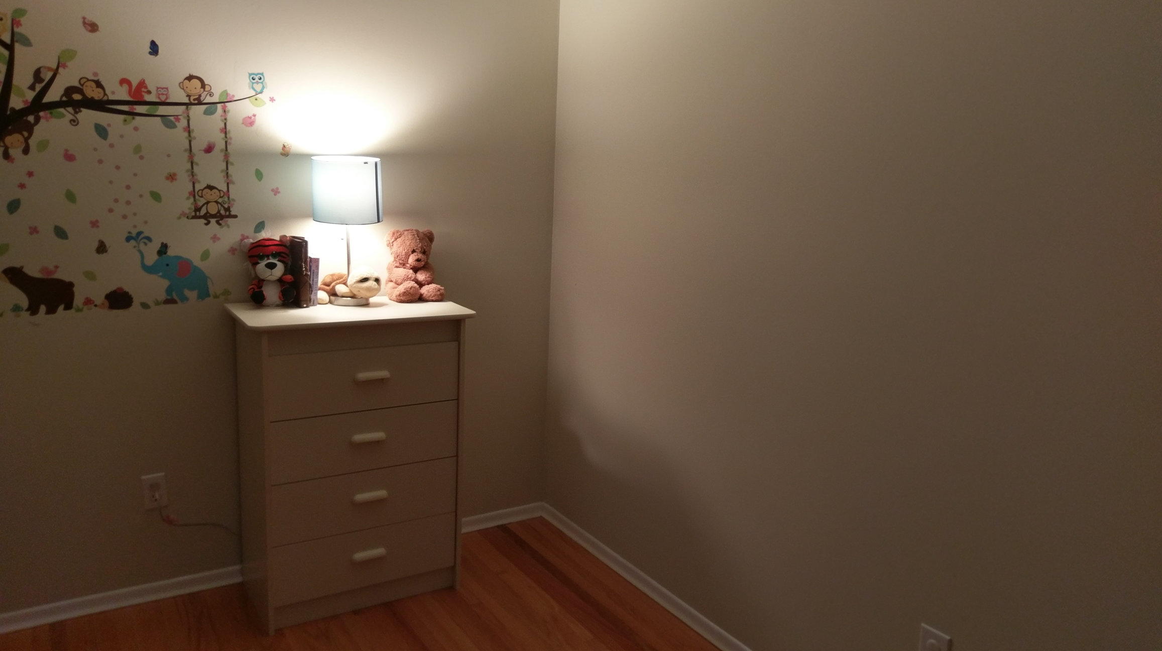 The curtains look green in the photo, but they're actually yellow, lol. Crib is going against that empty wall by the small dresser, and there will be an elephant decal above the crib, and a mobile. I'm planning to paint a kid fantasy landscape with some cutesy animals, too.