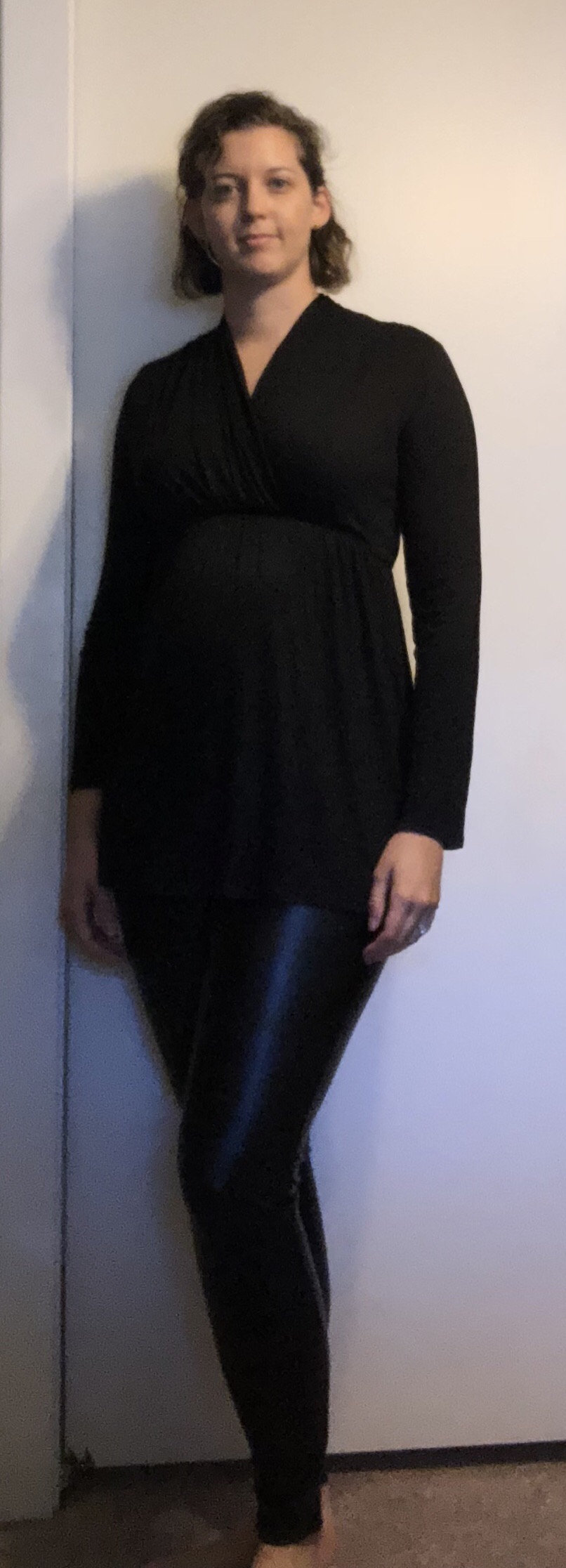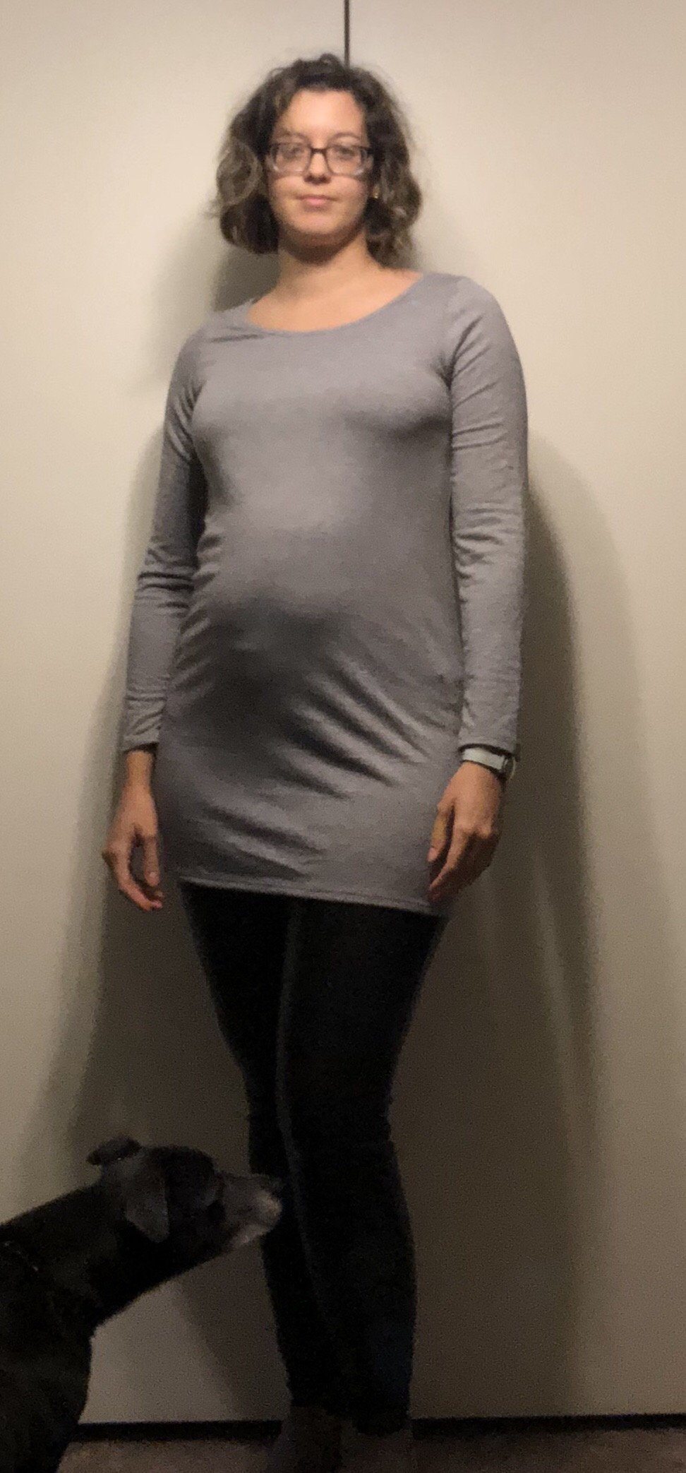 I like the grey top best too. As lelkcot suggested, a long loose cardigan could give you the look you’re going for, and I think you could have a lot of fun with accessories (try a long chunky necklace for example). Do you have black stilettos? (only if you’d feel ok balance wise with a baby bump, lol)