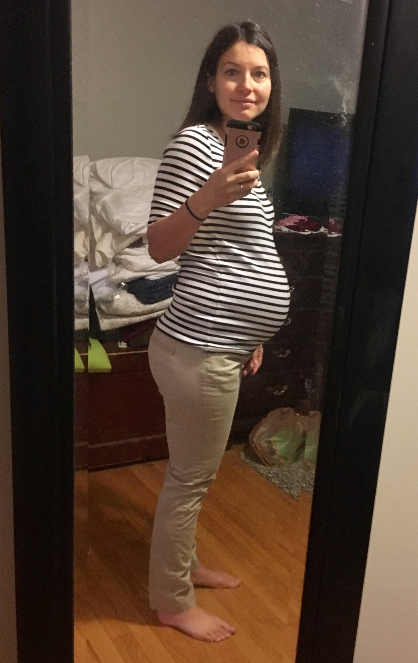 Lots of aches and pains. Feet hurt, hips hurt, left SI joint is killing me. Baby is head down and must be low because the pressure on my pelvis/colon/rectum is not pleasant. Still dealing with a significant amount of swelling in the calves, feet, arms, and hands. I bought a BP cuff and have been monitoring 2-3 times per day and BP is always fine (systolic has been between 110-130 and diastolic between 65-80). Cut out added sodium in my diet and that really seems to be helping. DH has also been giving me nightly foot rubs which I think is also helping to move fluid out of the tissues.