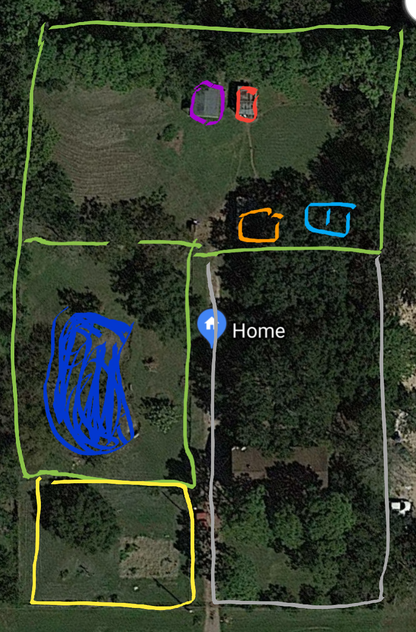 Here's our layout. Green is where our animals roam. Dark blue is our pond. The pond area can be closed off to keep our does and bucks separate as needed. Yellow is our garden area, grey is our house and yard where the boys play. Other colors are our pens.