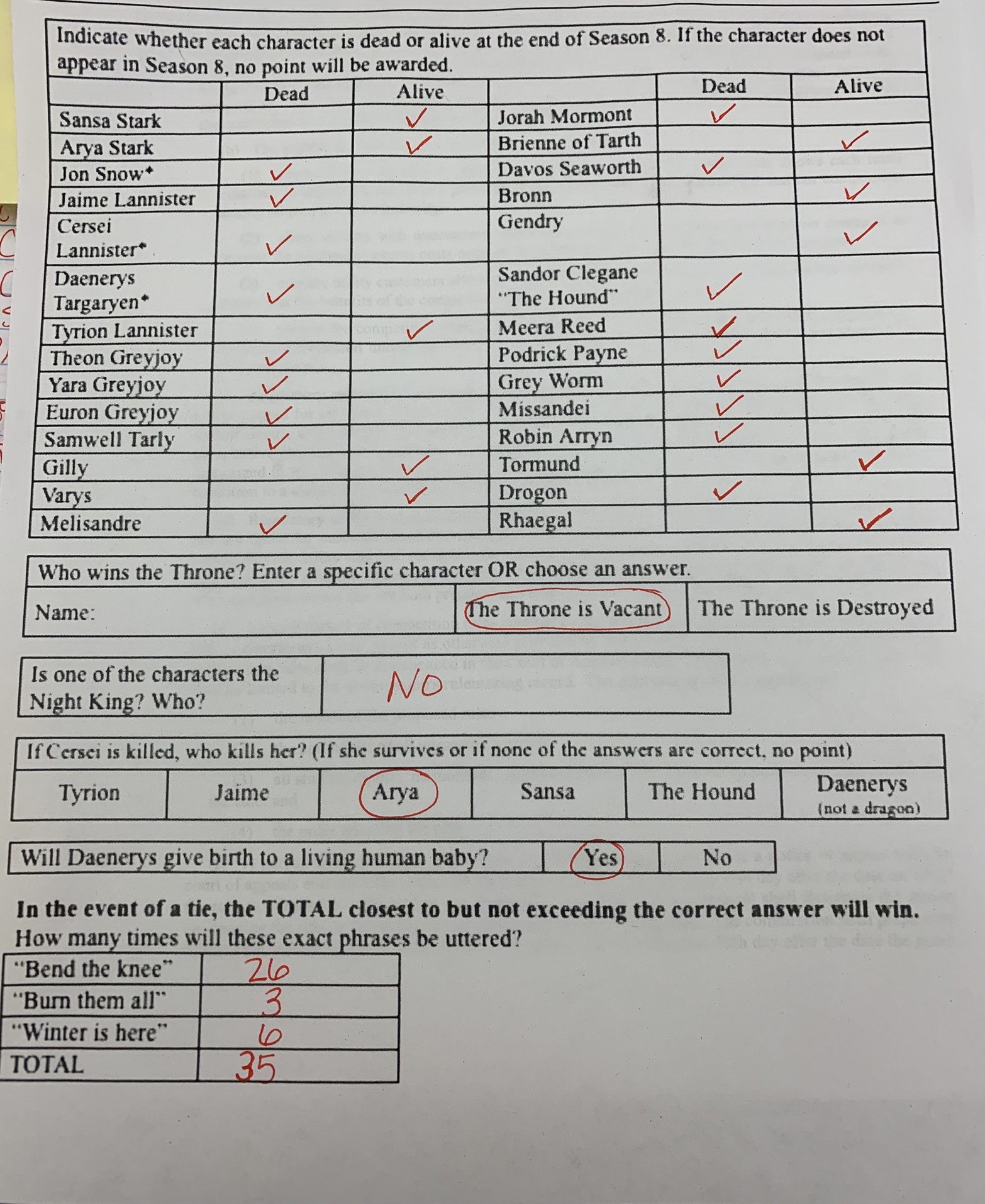 i also think they gave the Arya killing the Knight King away a little too soon - as soon as she spoke to the red woman and left the hall looking all determined DH and I both thought it was pretty obvious she was the one to kill the Knight King. However, I do think using the dager that was meant to kill Bran back in season 1 to save him and all of humanity was pretty solid.