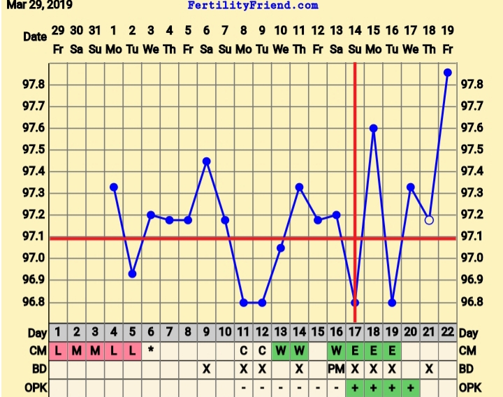 OPK question here. Yesterday was the fourth day in a row where my OPKs were positive (test line equally as dark as the control line). But I have had very little CM. Just a tiny bit of what I think was EWCM (hoping I didn't confuse it with preseed) on CD11 and creamy/watery since then. I haven't been drinking a lot of water so I wonder if it's affecting both the amount of CM I have and the OPK results. I put my chart below if that helps at all (I took my temp twice this AM because I think my thermometer is favoring the temp 97.18. I used the second temp but maybe I shouldn't have?).