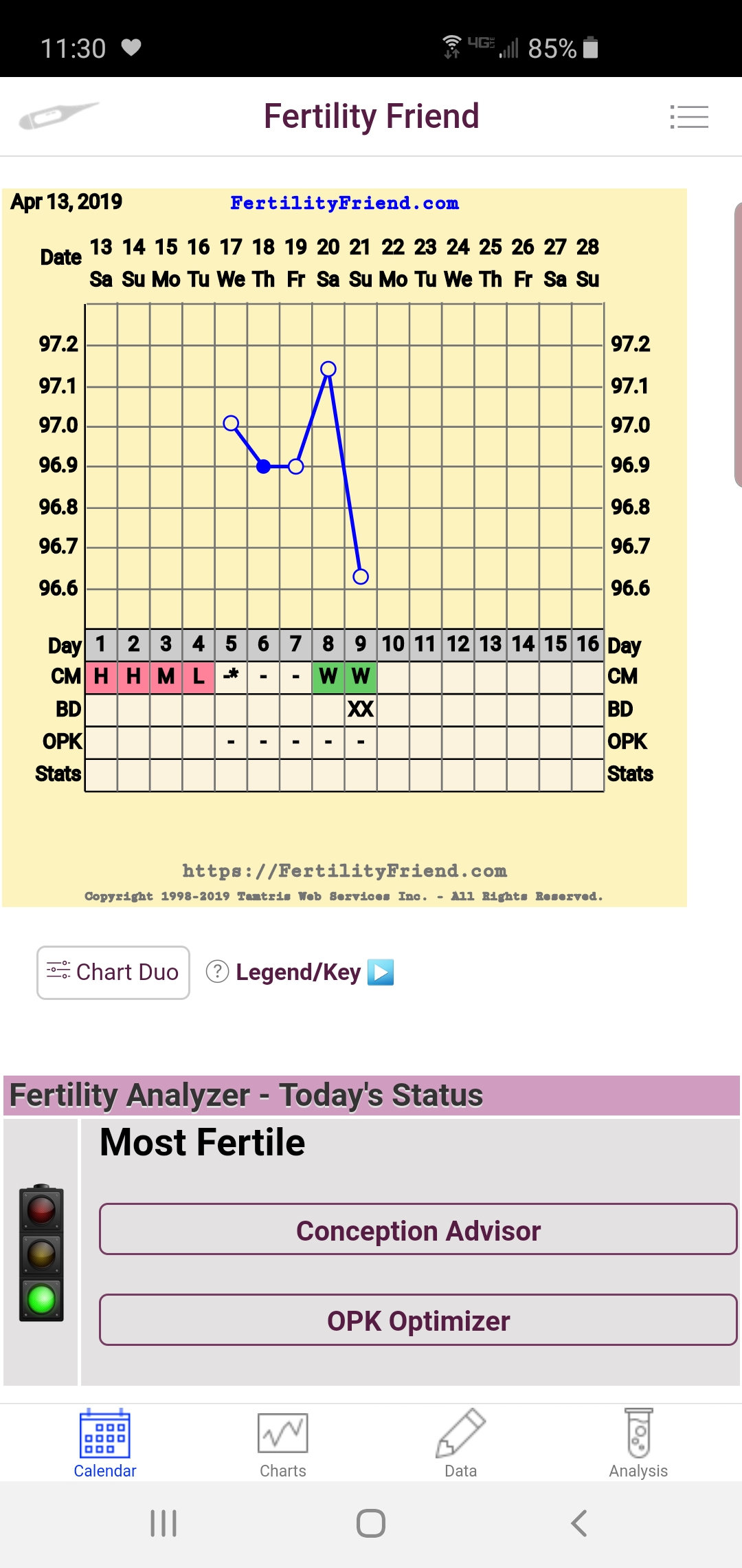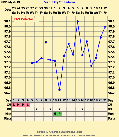 I think Fertility Friend is drunk...I got crosshairs this morning saying that O was on CD17, but I think it was more like CD19. I am tempted to discard the OPKs since they have been as dark as the control line basically all cycle. The only time I got a result where the test line was darker was on CD20, but going by CM and CP, I definitely O'ed before CD21. I also have no idea why my temp yesterday has an open circle because I took my temp at the usual time.