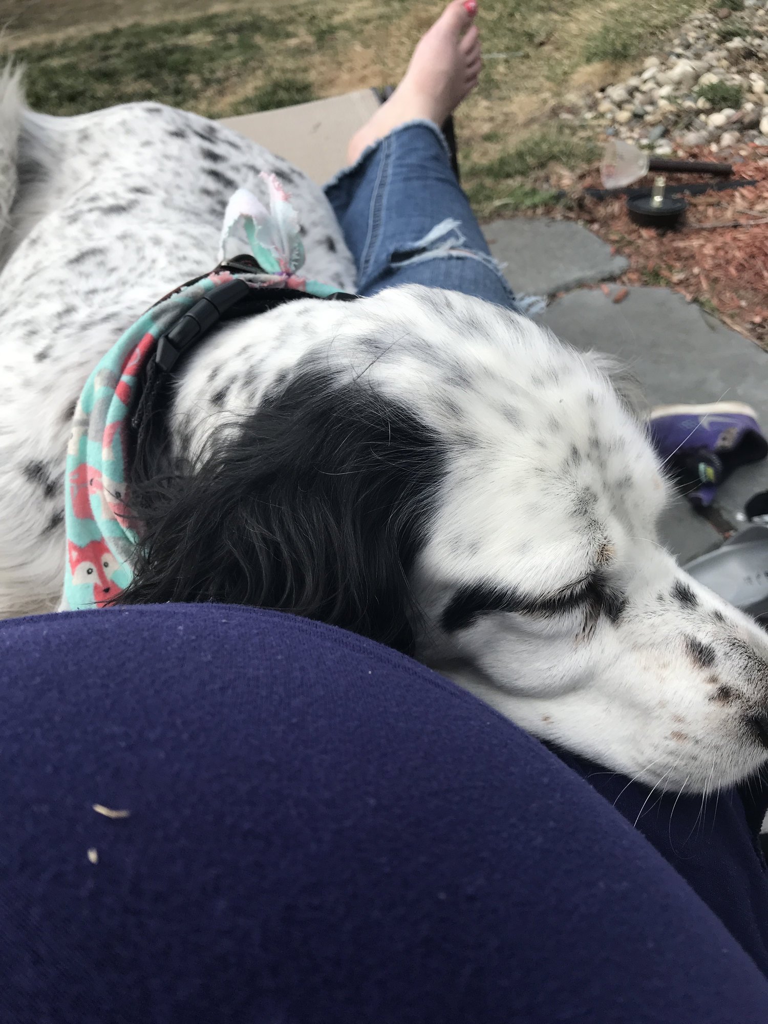 My fur baby has been super snuggly with me the past 2 days. I strongly believe animals can sense stuff that we can’t. So I don’t know if she senses labor or something is wrong? She usually sleeps on the floor but was right up next to me in bed last night(until I kicked her out lol). Here’s her outside today while we watch the kids play and daddy work