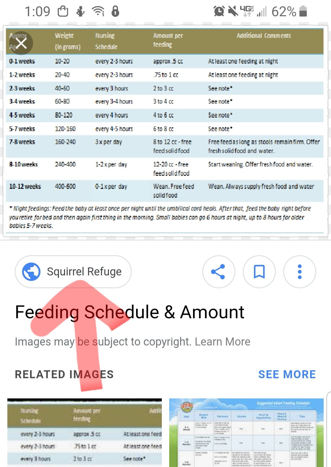 Yesterday I was searching for a chart that would show me how often a baby should eat and how much they should eat at each feeding, and how that changes by age. I opened a Google image and read it, but the amounts and timing seemed way off. But the amounts were in grams and cc's instead of pounds and ounces, so I convinced myself that maybe I was just confused due to the unfamiliar measurements. I spent an embarrassingly long time staring at the chart, trying to figure out if was accurate. Then I noticed that the row of the chart labeled 7-8 weeks and every row after said to offer "fresh solid food and water" for the feedings. I knew that was definitely incorrect and it finally occurred to me to check the source of the image.... It was a site called Squirrel Refuge. I was reading the feeding schedule for rescued baby squirrels. 🙈