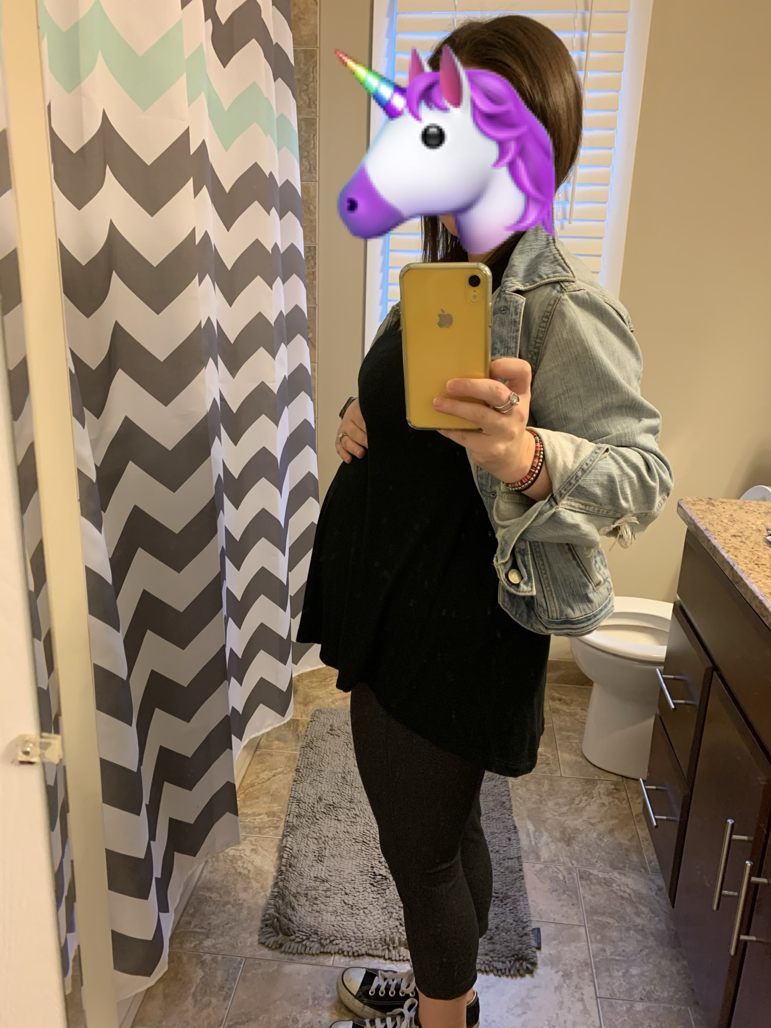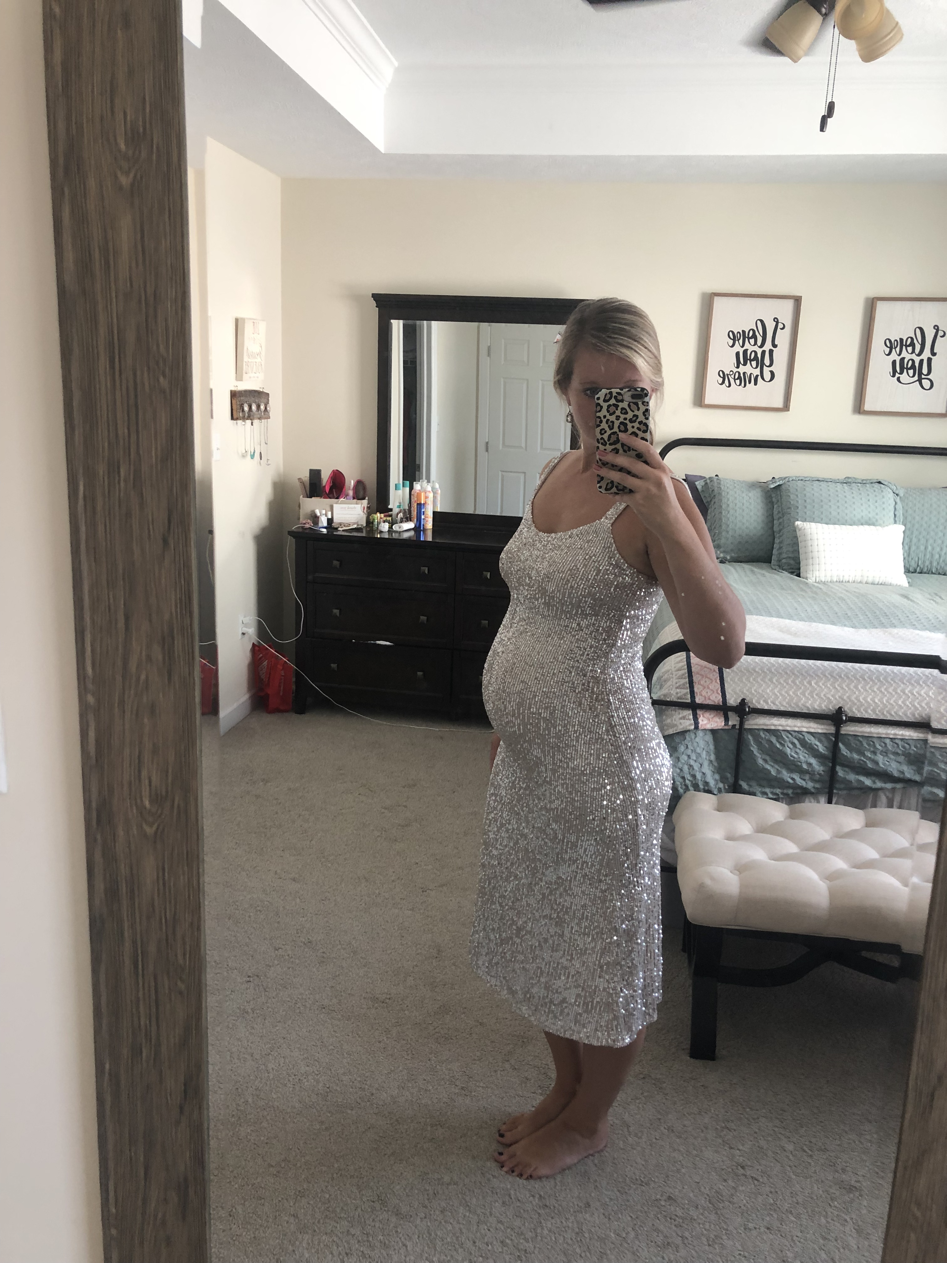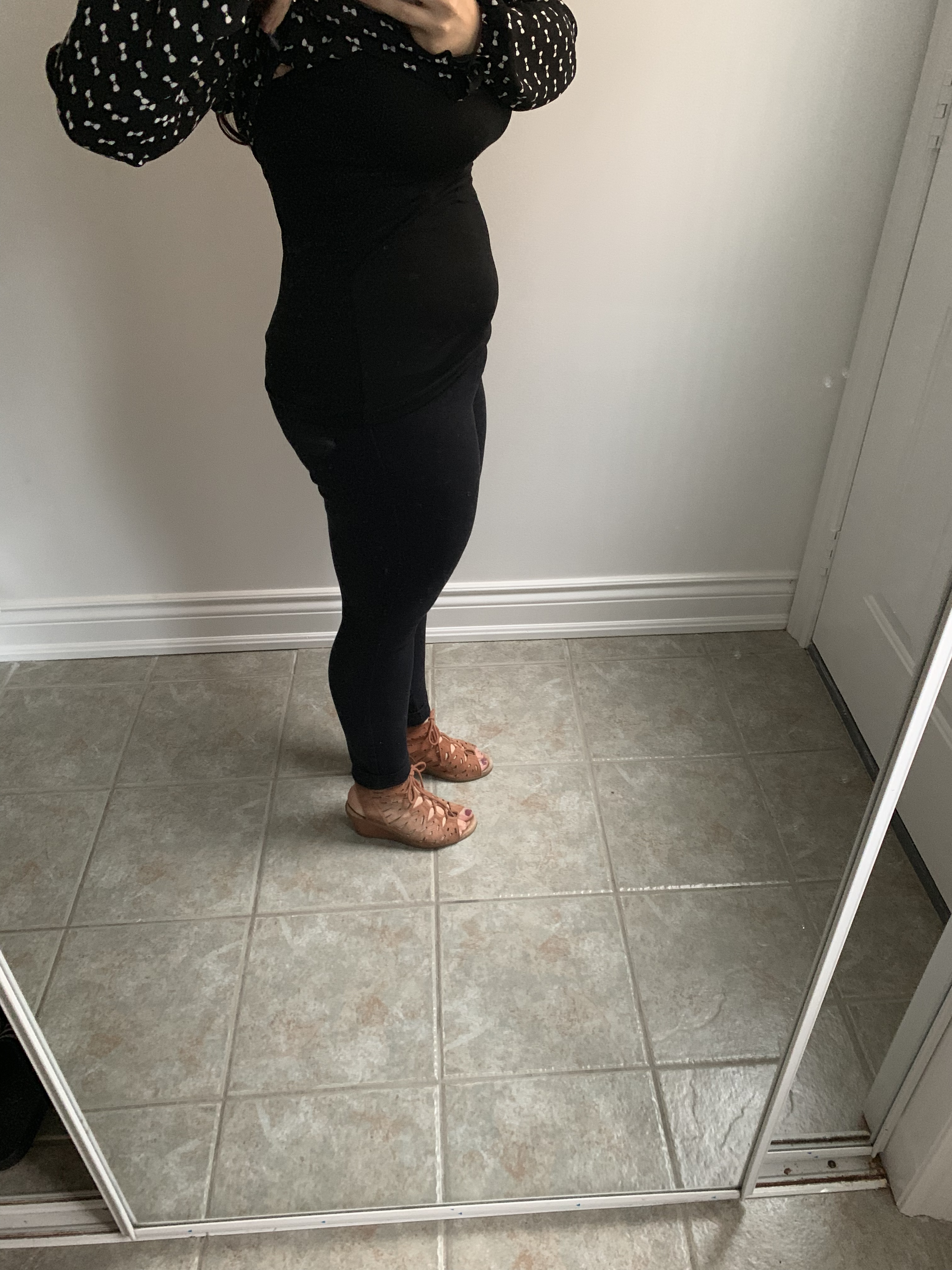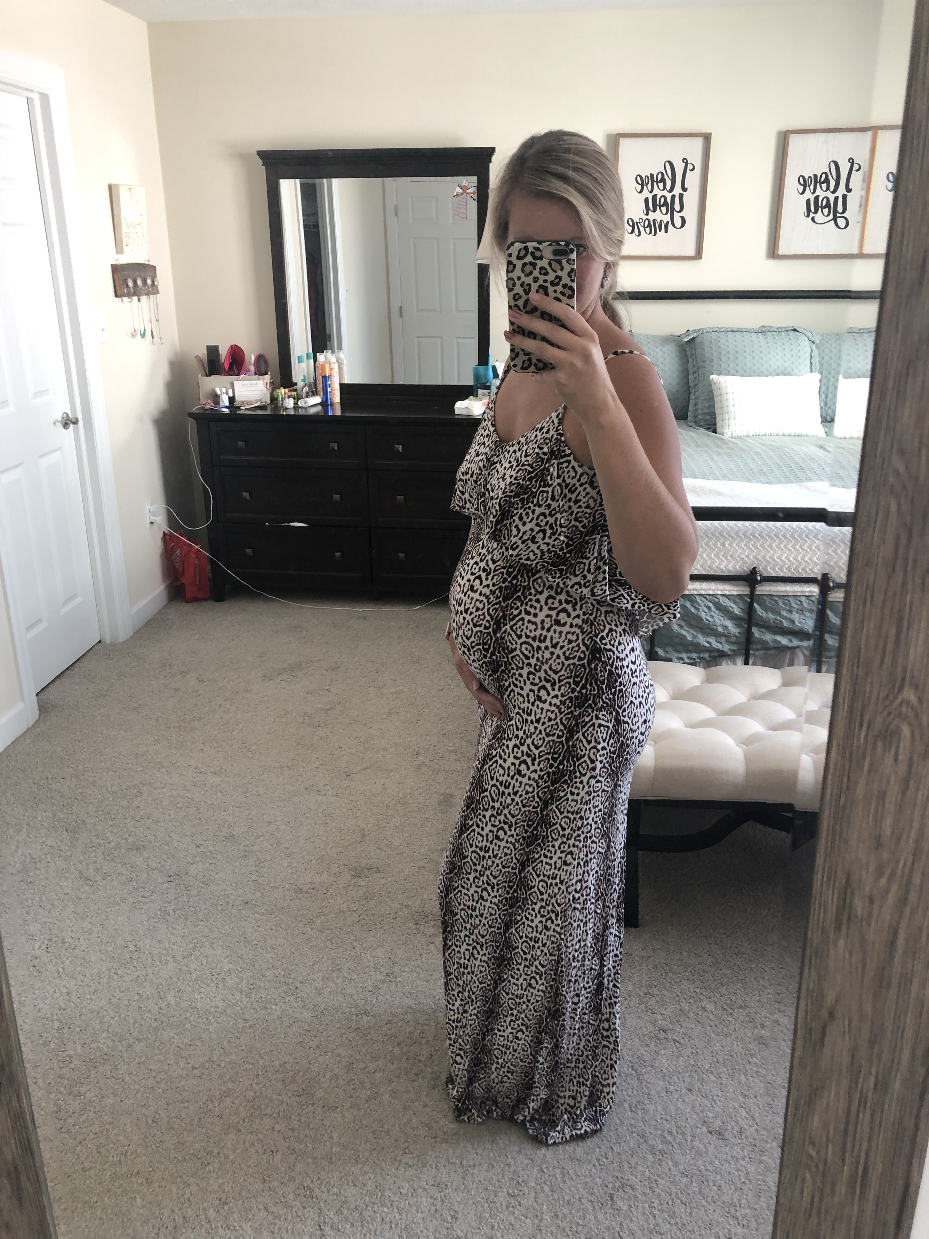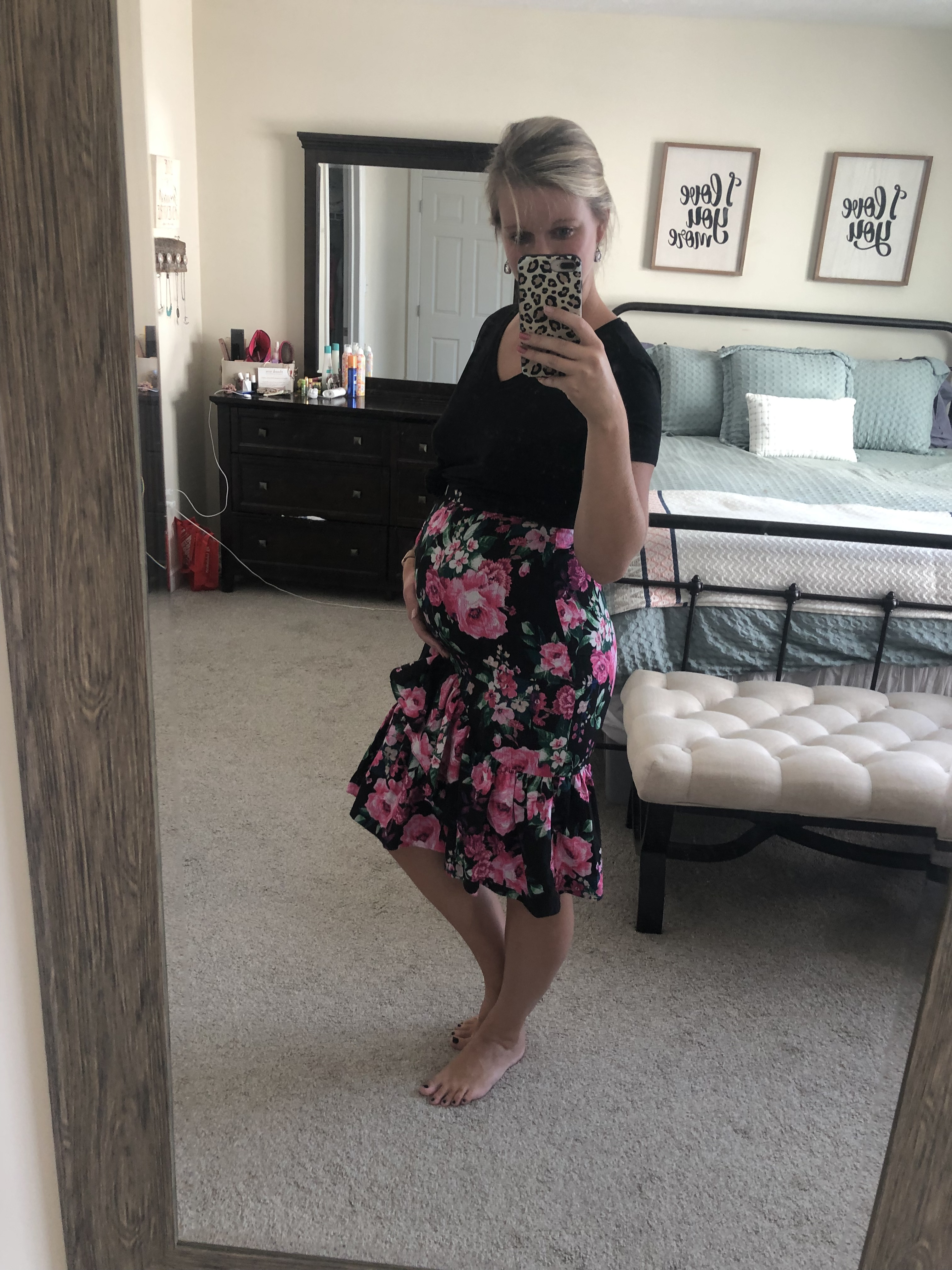 Thanks friends! I have an awesome leather jacket but I’m not 100% sure it fits atm. I’ll see. I’m leaning toward the leopard print because it’s the most comfy. It has a low back which I love. I think Im taking out the floral skirt because I had a hard time sitting in it and also being able to breathe. Lol. But it makes me feel like maternity Barbie so I love it nonetheless.