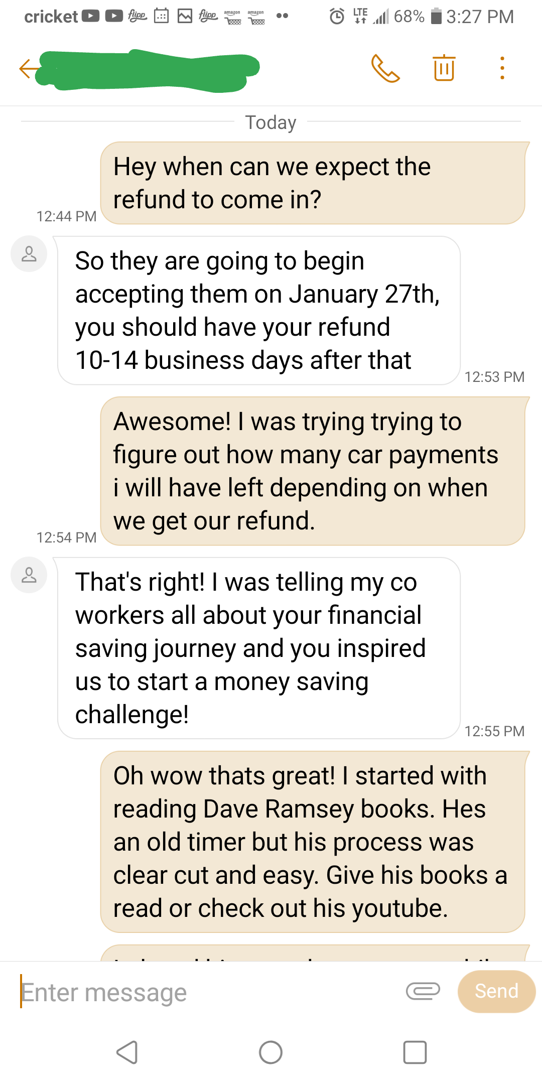 i started to explain why and hkw we are paying off our debt. She started tonask me how we oaid off so much debt with our income and kids. So i told her. I texted her today about when we could expect our refund and this is what she texted me back.