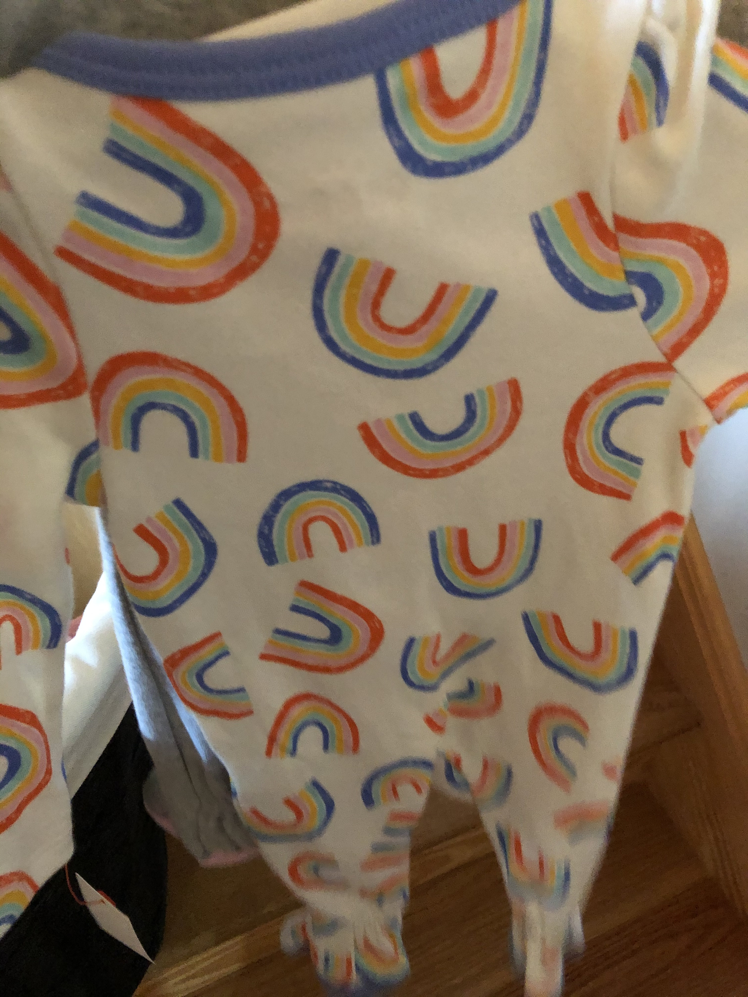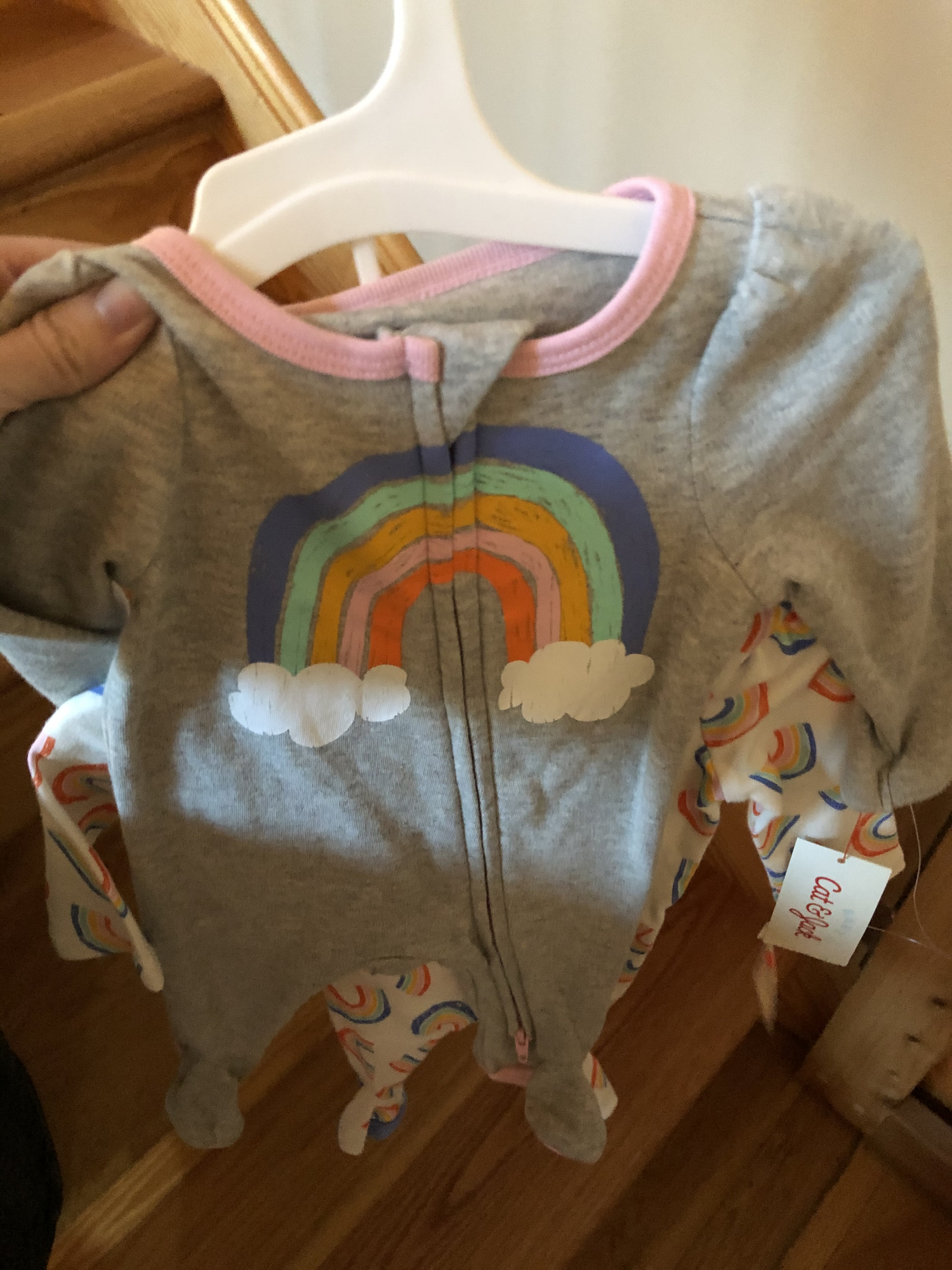 I found the cutest little sleepers on sale in a 2 pack for 4.50 from target. Would be super sweet for a rainbow baby. They are zipper cotton perfect for summer babes.