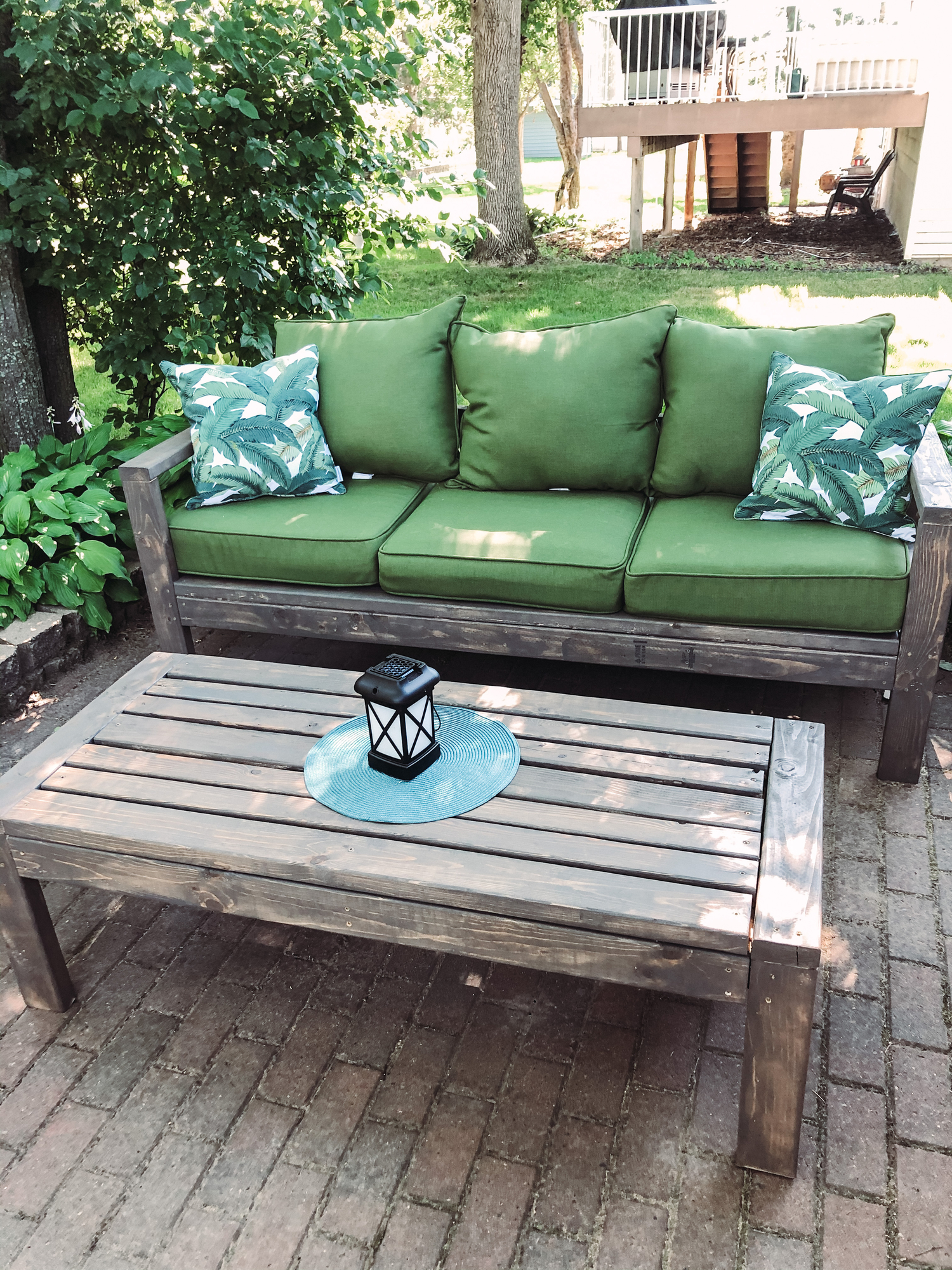I can’t take any credit for this but I did buy the pillows and pick out the Thermacell lantern. MH built me the sofa and table and found the cushions on sale at Lowe’s (it surprising how expensive outdoor cushions are).