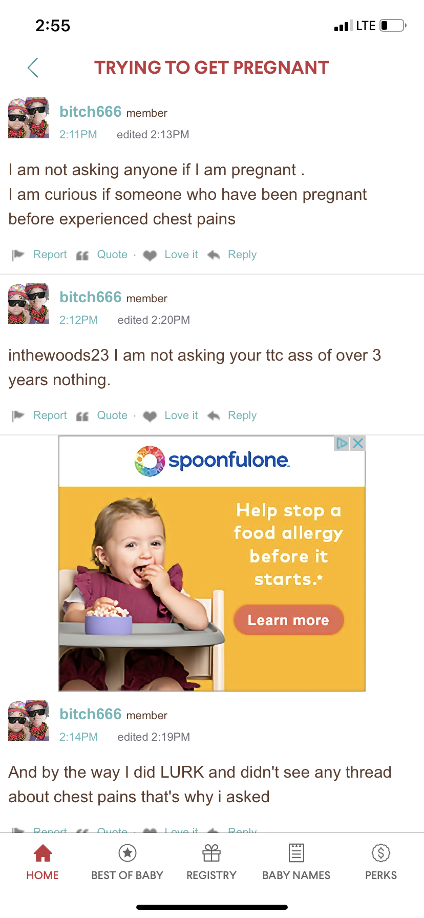 @mindyb2019 she spewed out a lot of random stuff in her rants after I made the general snarky comment wondering "are you sure you want to ask my 'TTC for over 3 years' ass about pregnancy symptoms". Blah blah blah mother f'ers, blah blah blah bitches. She's got 5 kids, she's a breeder.