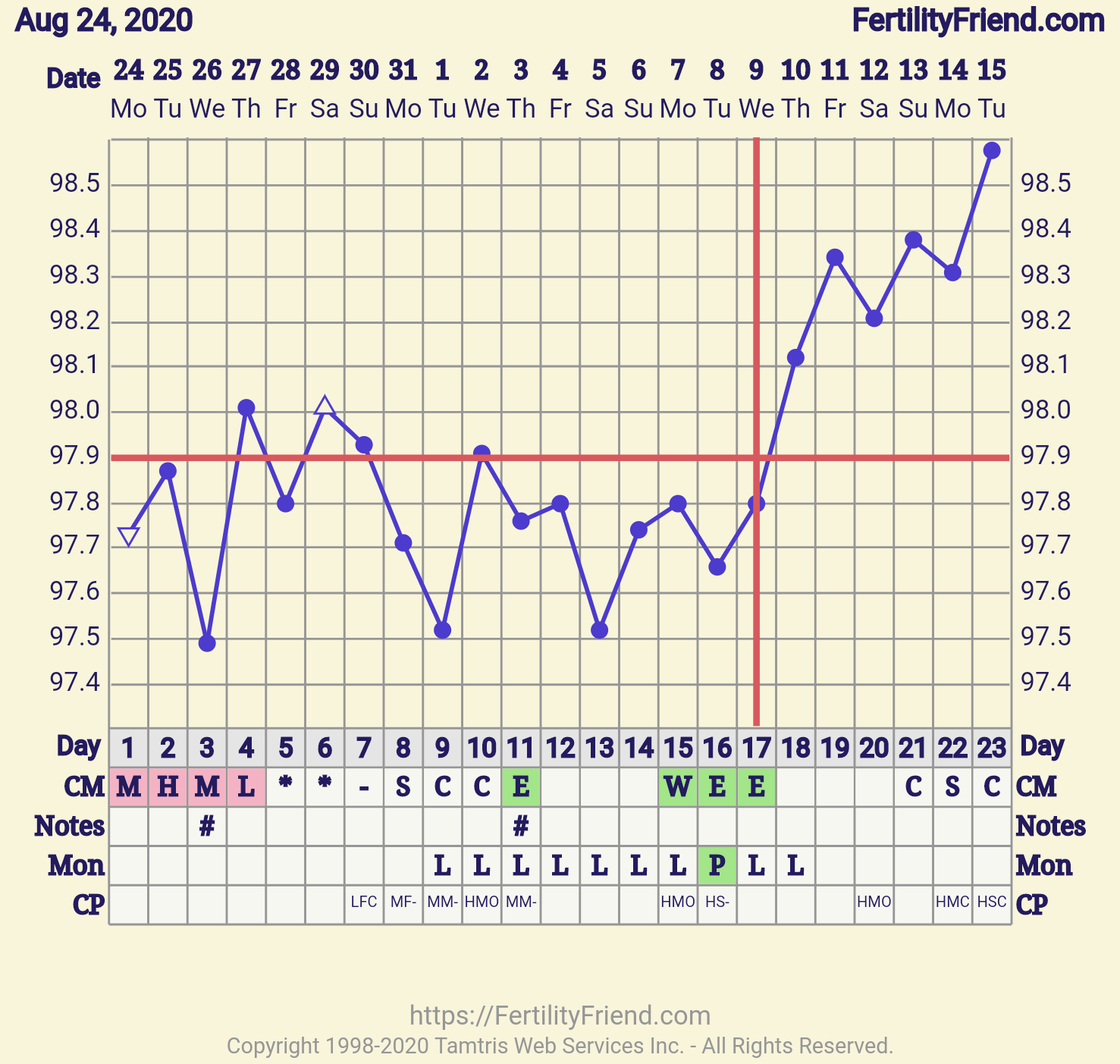 Rant: I am trying not to SS, but I have tons of creamy CM, and I am not seeing my usual AF symptoms for a week out. I usually get a sour stomach, for lack of a better term, a week before AF, but nothing like that this week so far, so I am thinking all the things. The nice temp rise this morning didn't help my SS (or rather lack of symptoms to spot) either.