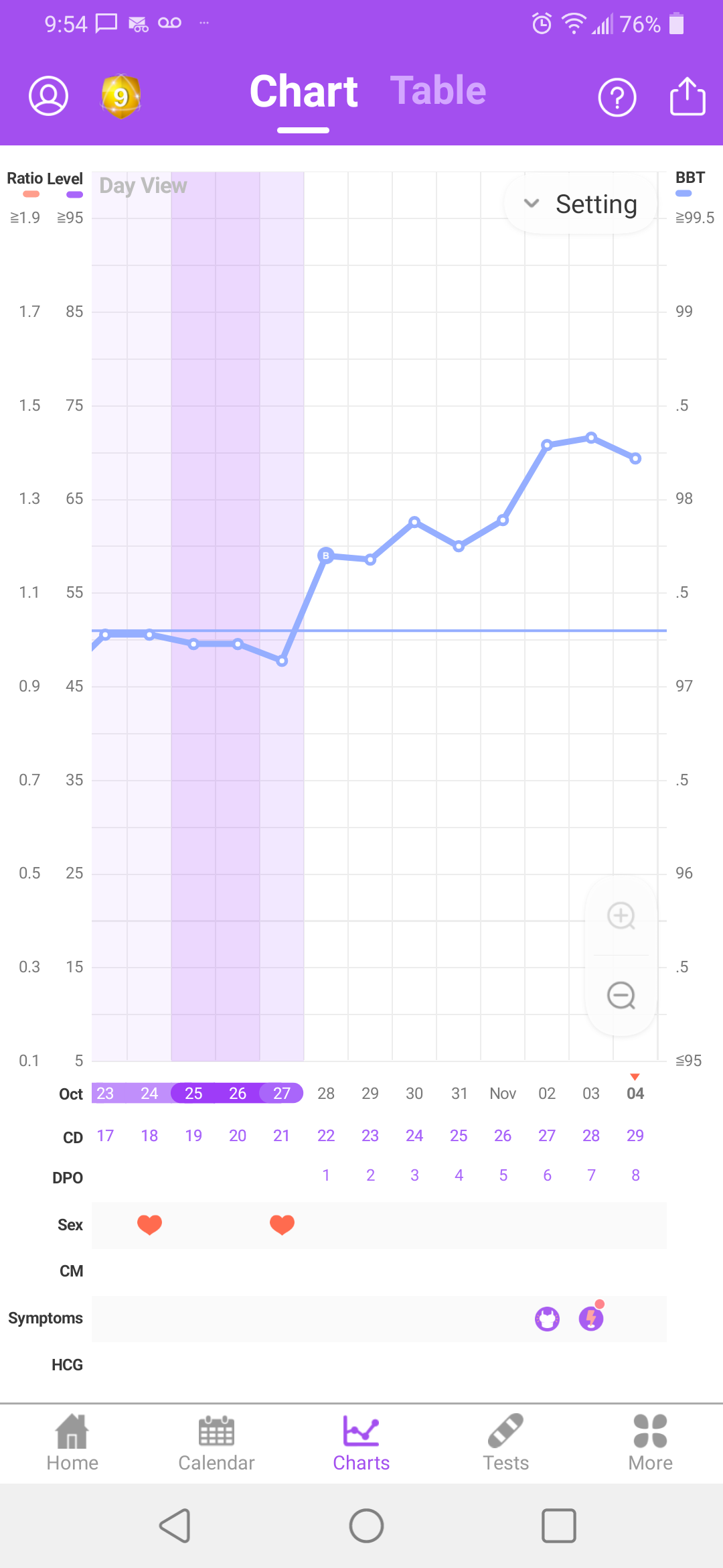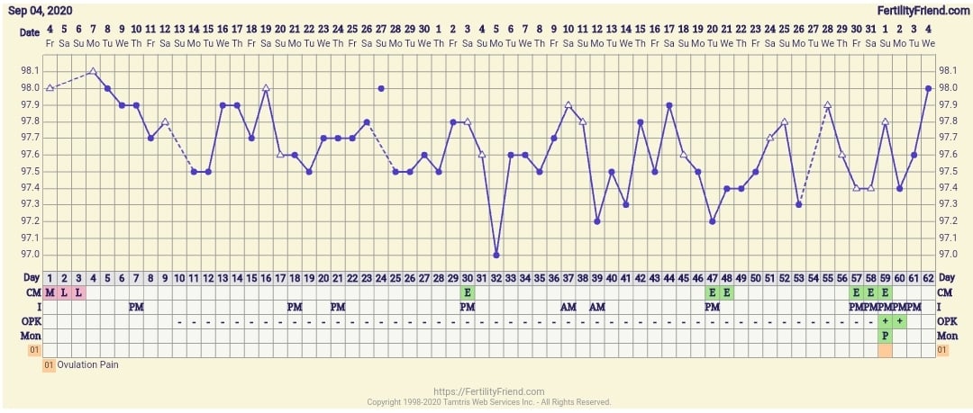 CS/Q: I didn’t get a temp this morning because my sensor is acting up again. I am hoping I get a new one after this. I’m just glad I’m not trying to confirm ovulation or I would be really upset. So no chart today because it’s the same as yesterday’s.