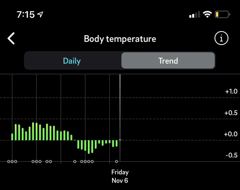 CS/Q: here’s the temp trend report from my Oura ring. Temps that are above 0.0 degrees are my luteal temps from last cycle; those below are from follicular phase this cycle.