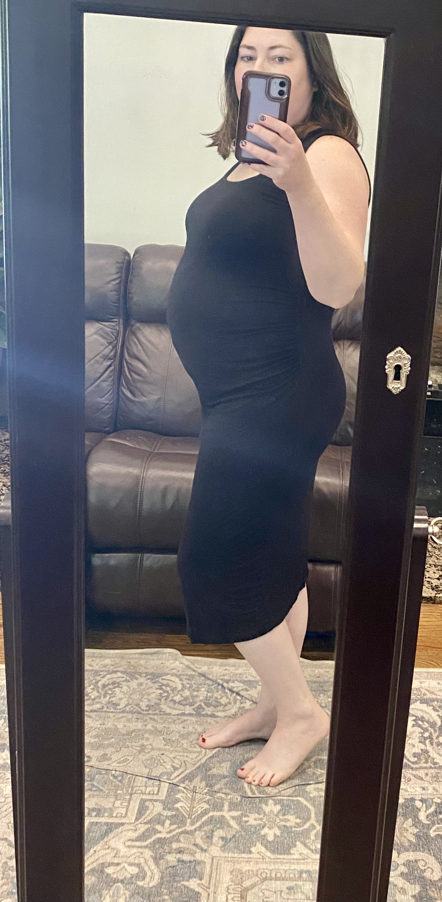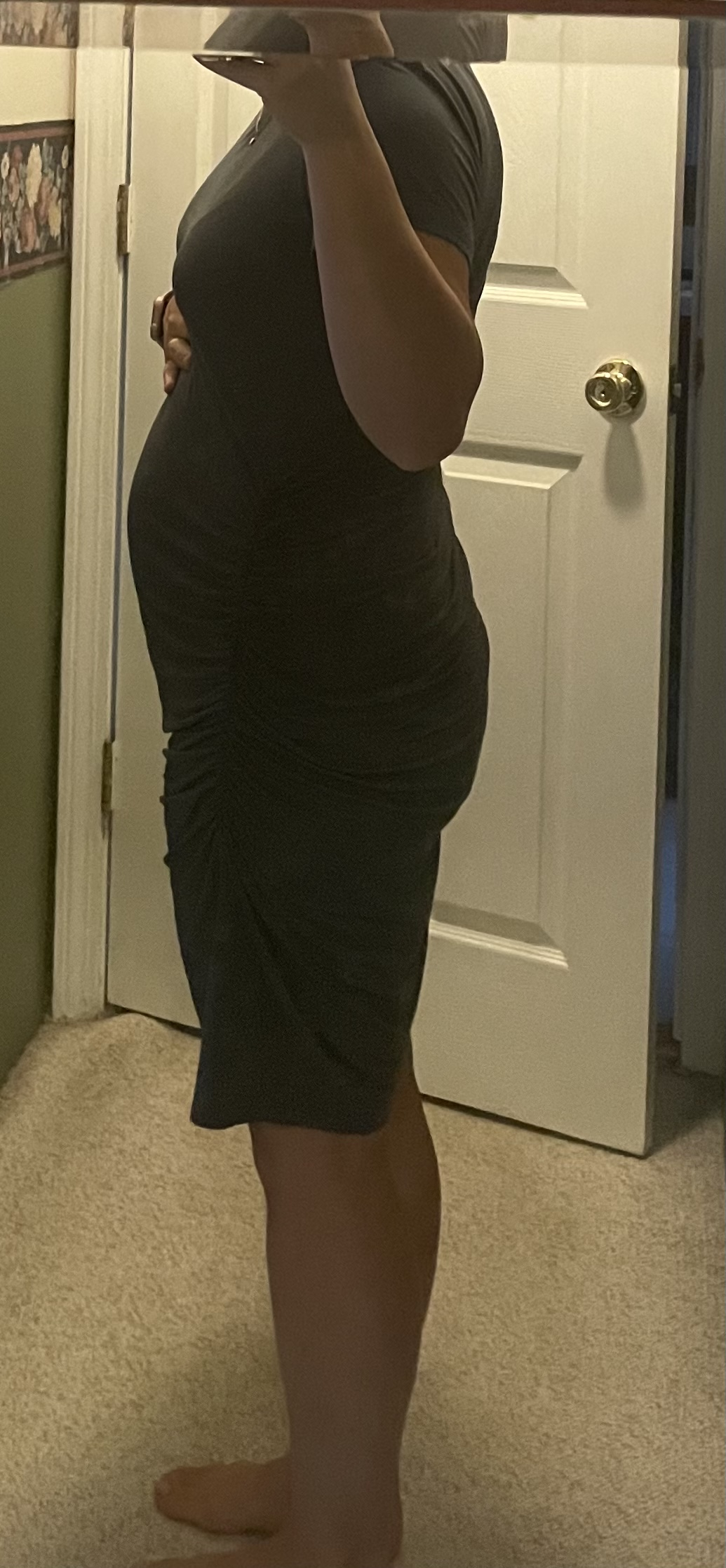 13+3 with pokey bump (TTM). Pregnancy dress still VERY loose, but don’t care super comfy.