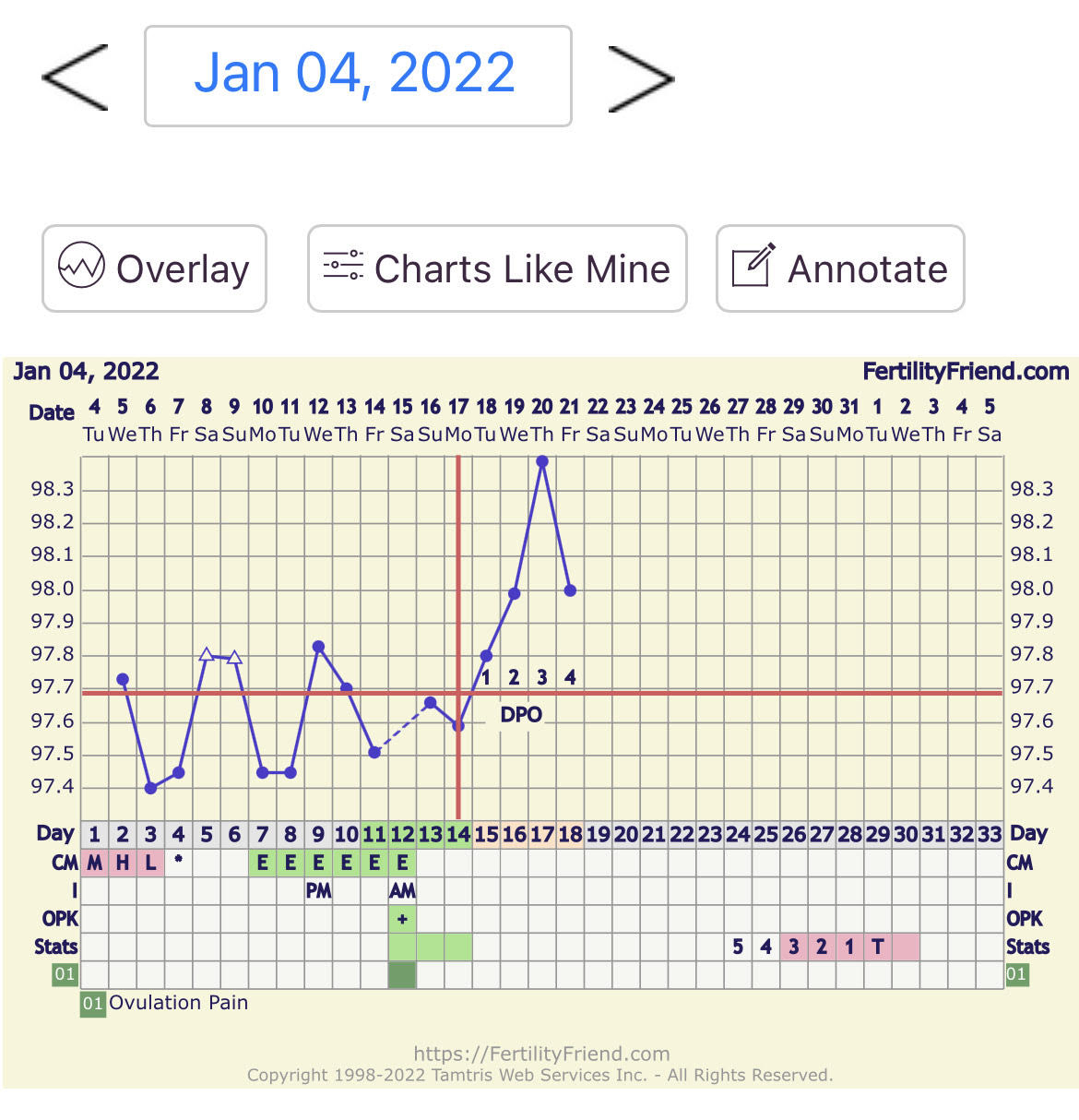CD/DPO: 18/4. Although I think it might be a bit different. I didn't temp on CD12, and I think that messed it up a bit. Comparing to old charts, I almost always drop below the CL 2 days after O so I feel like if I had CD12 temp in there the CH might move.