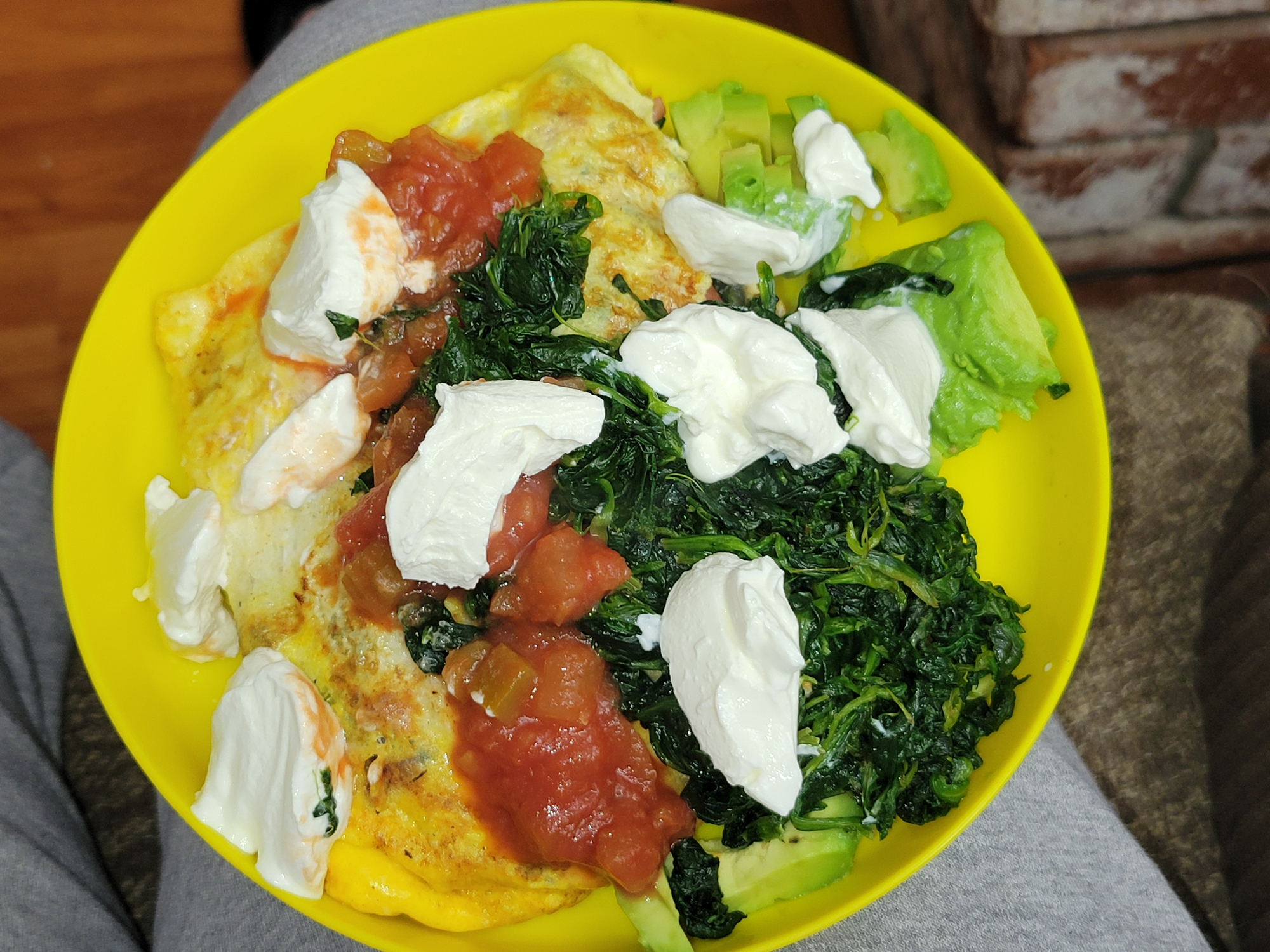 Per my request, the boy person made me an omelet. Highly nom. Spinach, garlic bologna, garlic, cheese, green peppers, avocado, salsa, and sour cream.