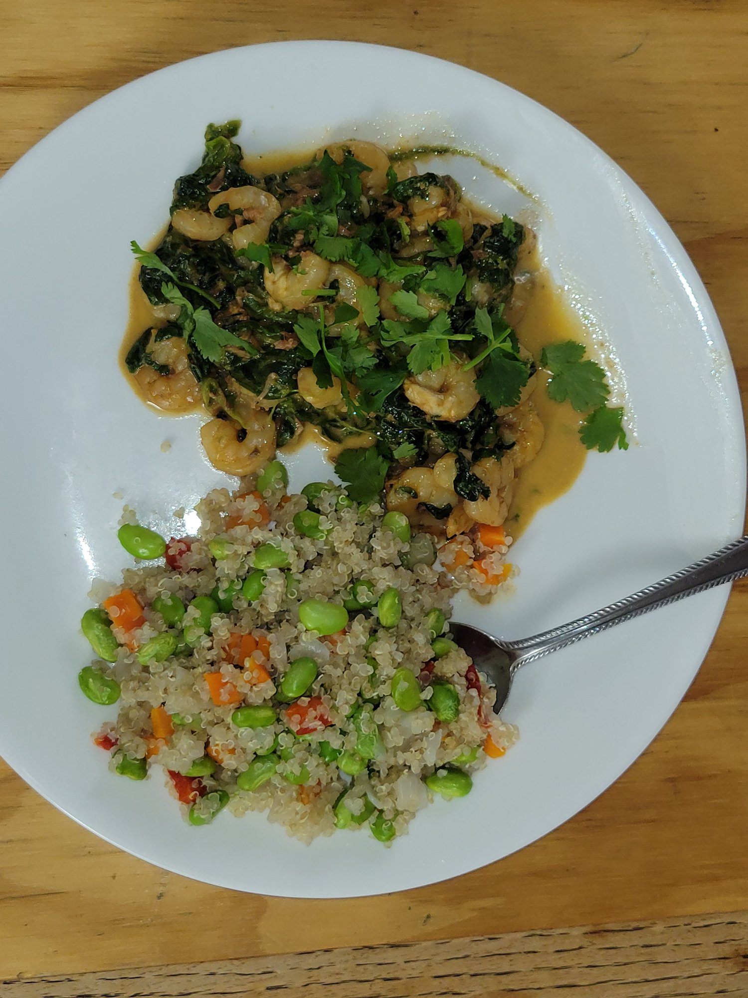 Ok, slightly healthier. Curried shrimp and spinach garnished with cilantro and some quinoa with edamame, carrots, and red bell pepper.
