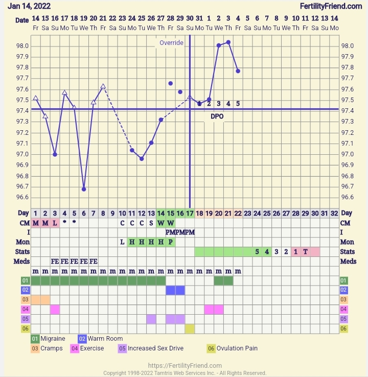 CS/Q: FF still has no idea what to do with me this month. Trying different detectors and discarding/not discarding the temps the days I had a warm room gives me 3 separate CH days, none of which being where I actually think they should be lol. Guess we'll find out when/if I get my period.Oct '21 somewhat improved AMH (.51) and significantly improved FSH (8.9). Maybe it's all the pills I swallow.