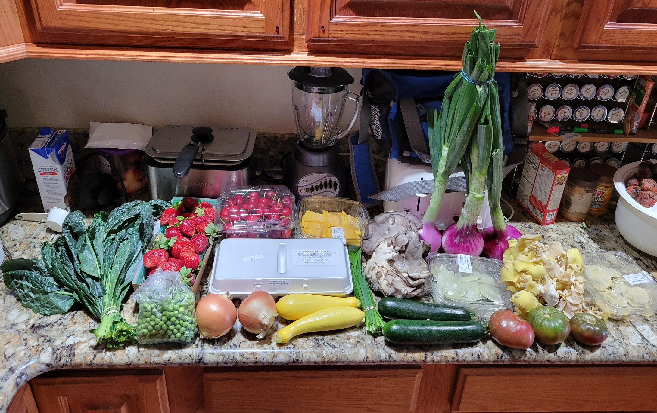 Today's farmer's market food porn. Kale, strawberries, shelled sweet peas, cherries, butternut squash ravioli, extra large brown eggs, yellow onions, yellow squash, garlic chives, blue oyster mushrooms, red onions w/the greens, artichoke raviooli, zucchini, heirloom tomatoes, golden oyster mushrooms, and mushroom ravioli.