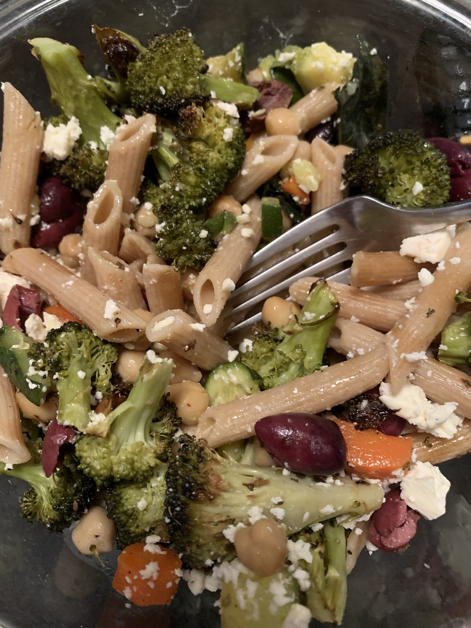 Hubs made whole wheat penne with roasted veggies and chickpeas, feta, and (on my request) kalamata olives. I go through at least one kalamata olive jar a week.