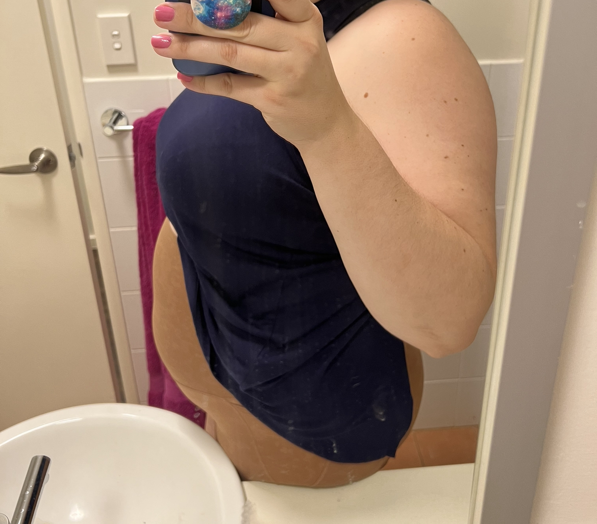 @kboydbowman your bump looks like a capital B. I tend to not take photos without my pants on because I’m not a fan of it, but this is it somewhat smoothed out, but you can see around where my bellybutton is it indents in.