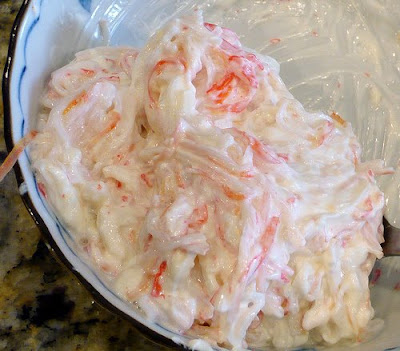 In a small bowl, make the filling by combining 2-3 large spoons of softened cream cheese with 3 crab sticks. If your cream cheese is not softened, you may need to microwave it for a few seconds. Hard cream cheese will not mix with the crab well, so make sure it is soft.