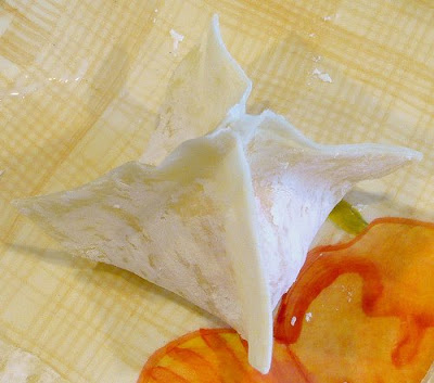 Take the four wonton skin corners, and bring them all up and towards the center. When the corners meet, gently press in both the center, as well as along the seams running down the sides. Wrapping in this fashion will create a shape such as this: