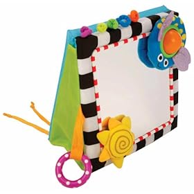 • We have this crib mirror and LO loves admiring himself.  He likes to either grab or kick the ring that hangs. We found it for 14 bucks and is well worth the $$.