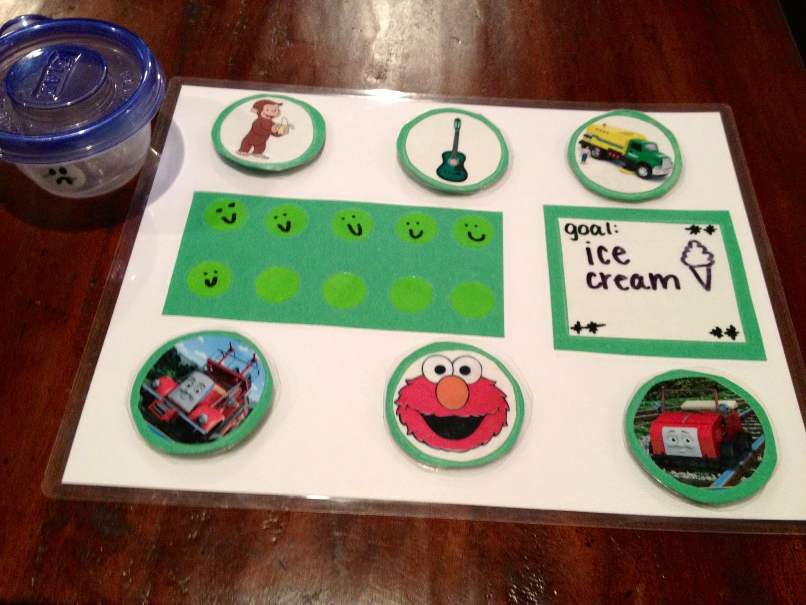 Edit: Short version in case you don't want to follow link. They start the day with 6 coins (the characters, these are velcroed on). Bad behavior: lose a coin. Good Behavior can earn them back. End the day with all your coins, get a smile face. 10 smiles (or whatever you set) = big reward