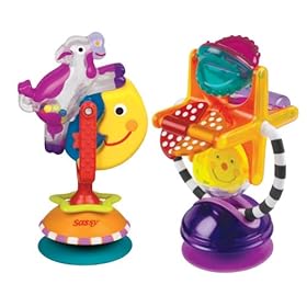 I just got something similar to the one on the right. The one I got from Target makes noise when you spin it and DD LOVES it but she can pull the toy off the suction cup part.