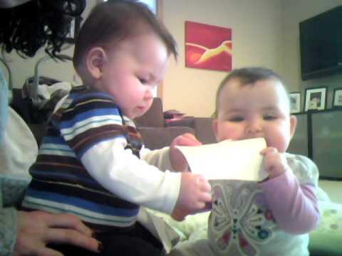 Mason loves to give kisses. He grabs with both hands and plants a big open mouth kiss. He started doing this to Aubrey when I was playing with them today. I happened to have my computer next to me and was able to catch it on the computer camera. They are also fighting over a piece of paper, it was cute to see them keep stealing it from each other.