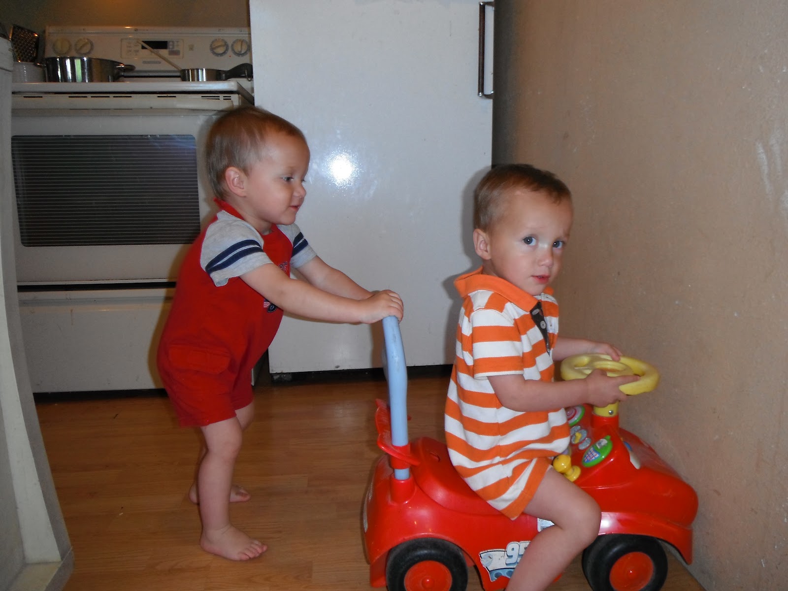 Here's my guys. Oliver was sitting on the little car and Sam came along and kept pushing it into the wall.