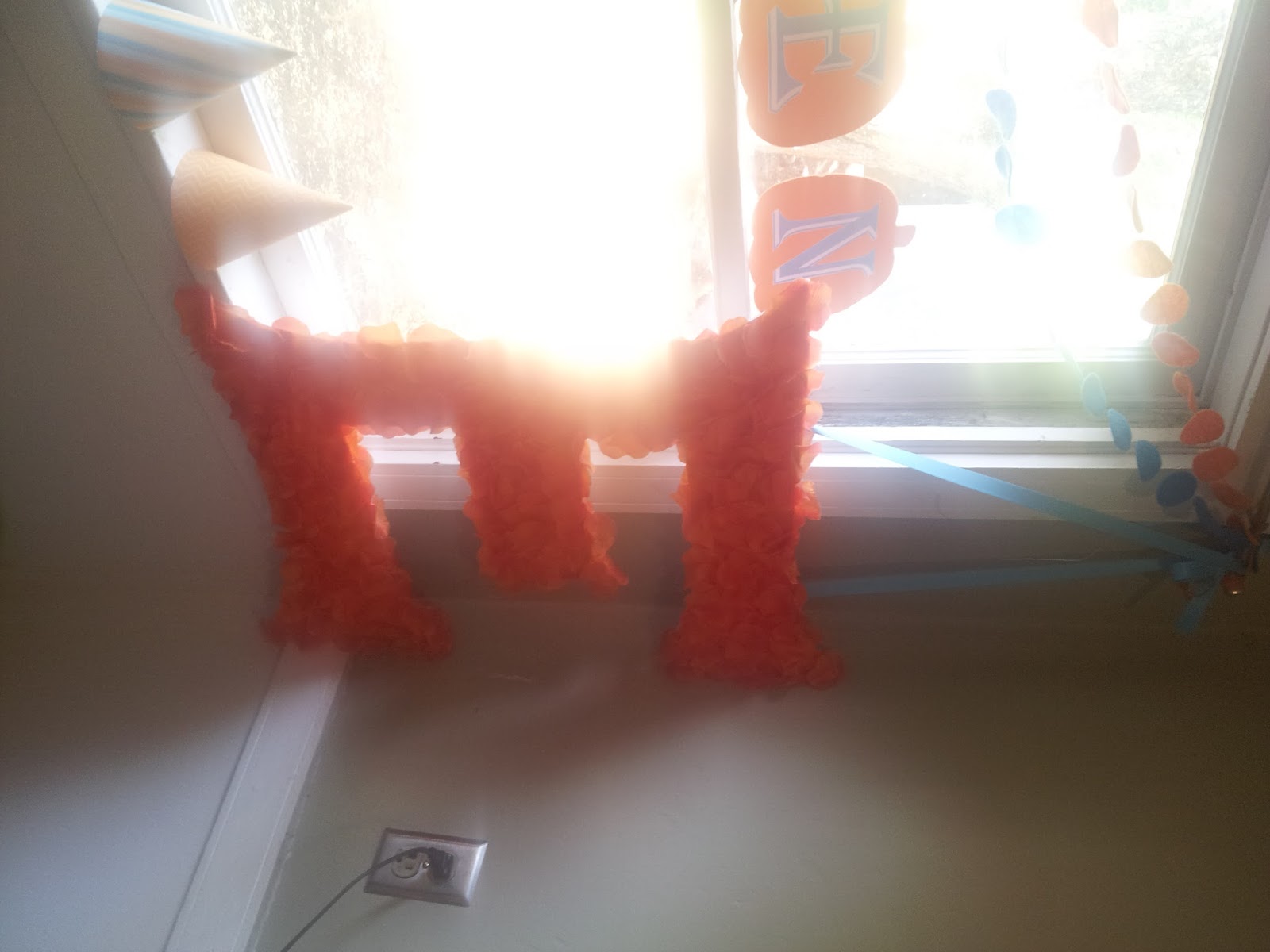 Giant letter E I made with foam board and fake rose petals. You can kind of see the foam pumpkins I got from the Target dollar bin and glued teal letters to spell out Happy Birthday Eden.