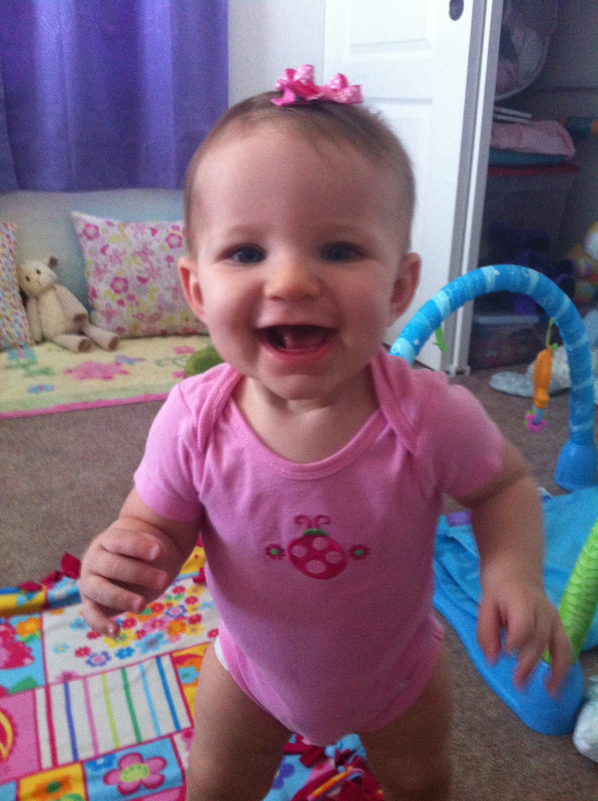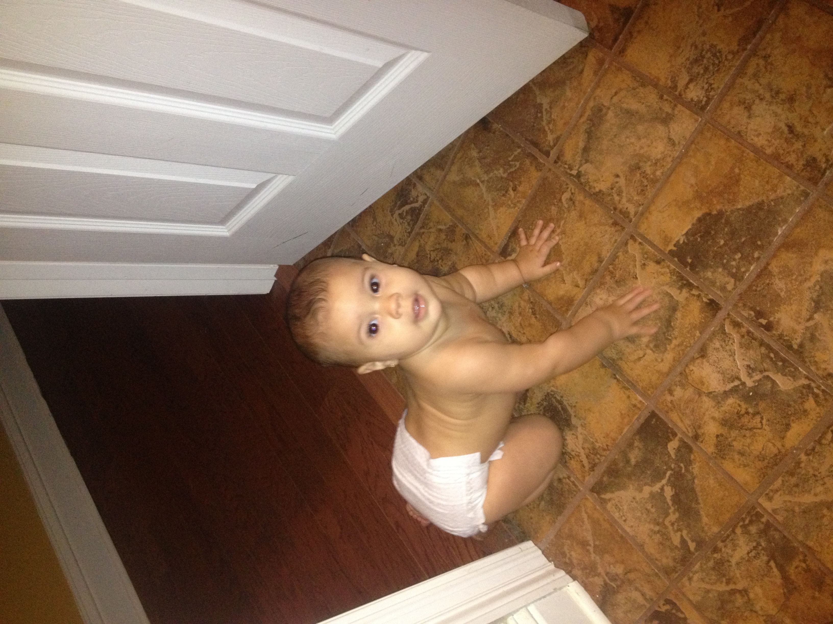 She has been crawling for over a month but just realized she can follow you. Also I realized I am bad about taking pictures because I don't have a picture fo her standing unassisted. Note to self get on that