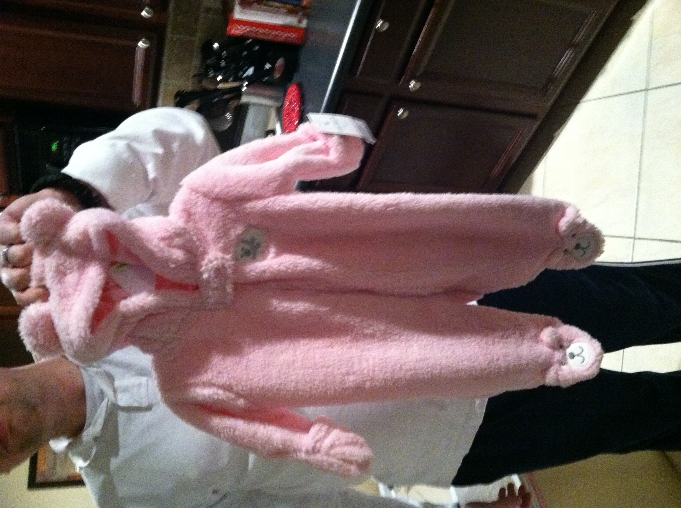 Don't laugh but on of the first outfits we bought was a pink teddy bear outfit for our little girls first Halloween. We will be going to my parents to hand out candy and see my three nieces go trick or treating. Sorry it is sideways but you get the idea.