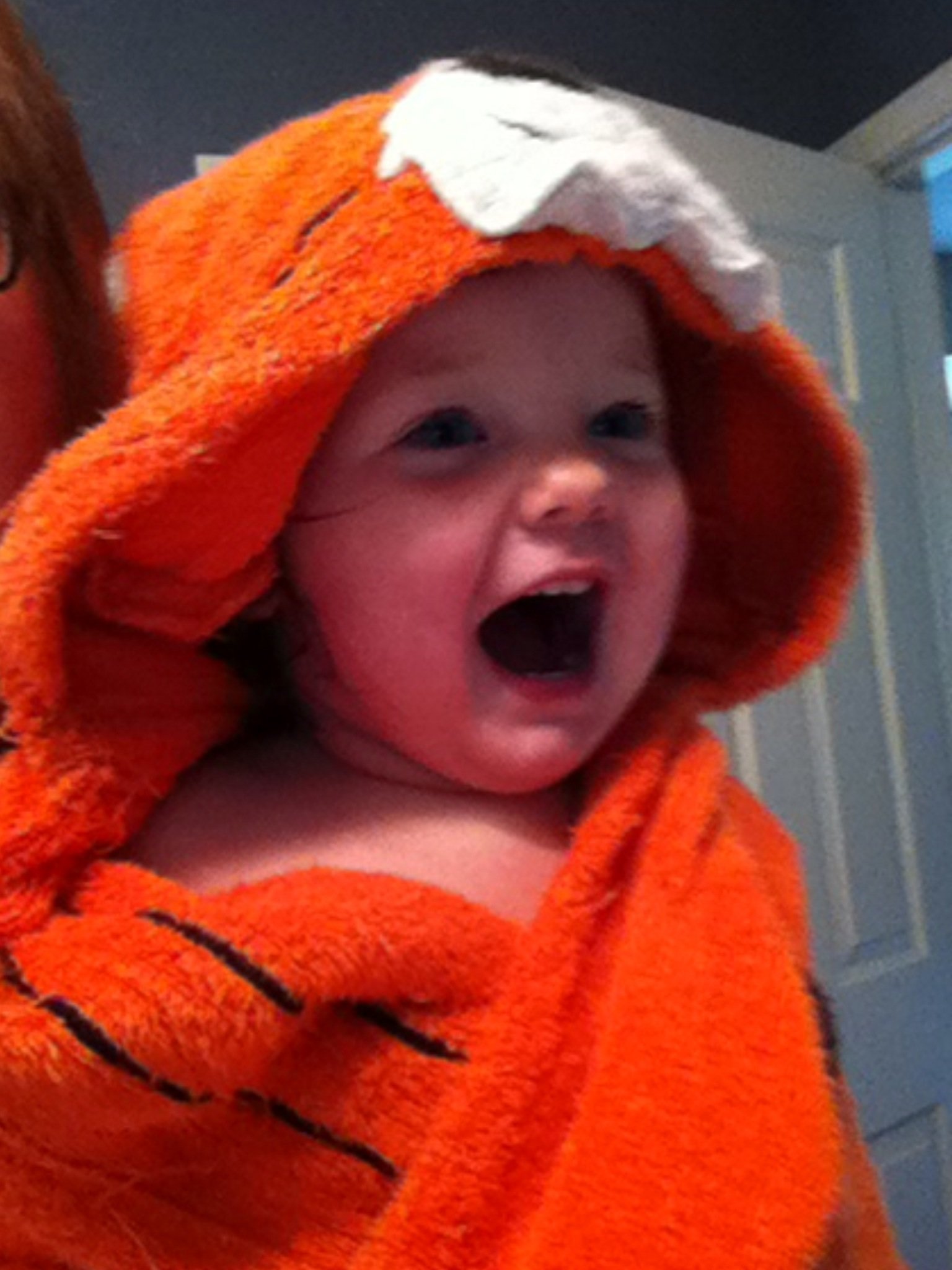 R is for... Roooaaaarrrrrr (she does this every time we wrap her up in her Tiger Towel).