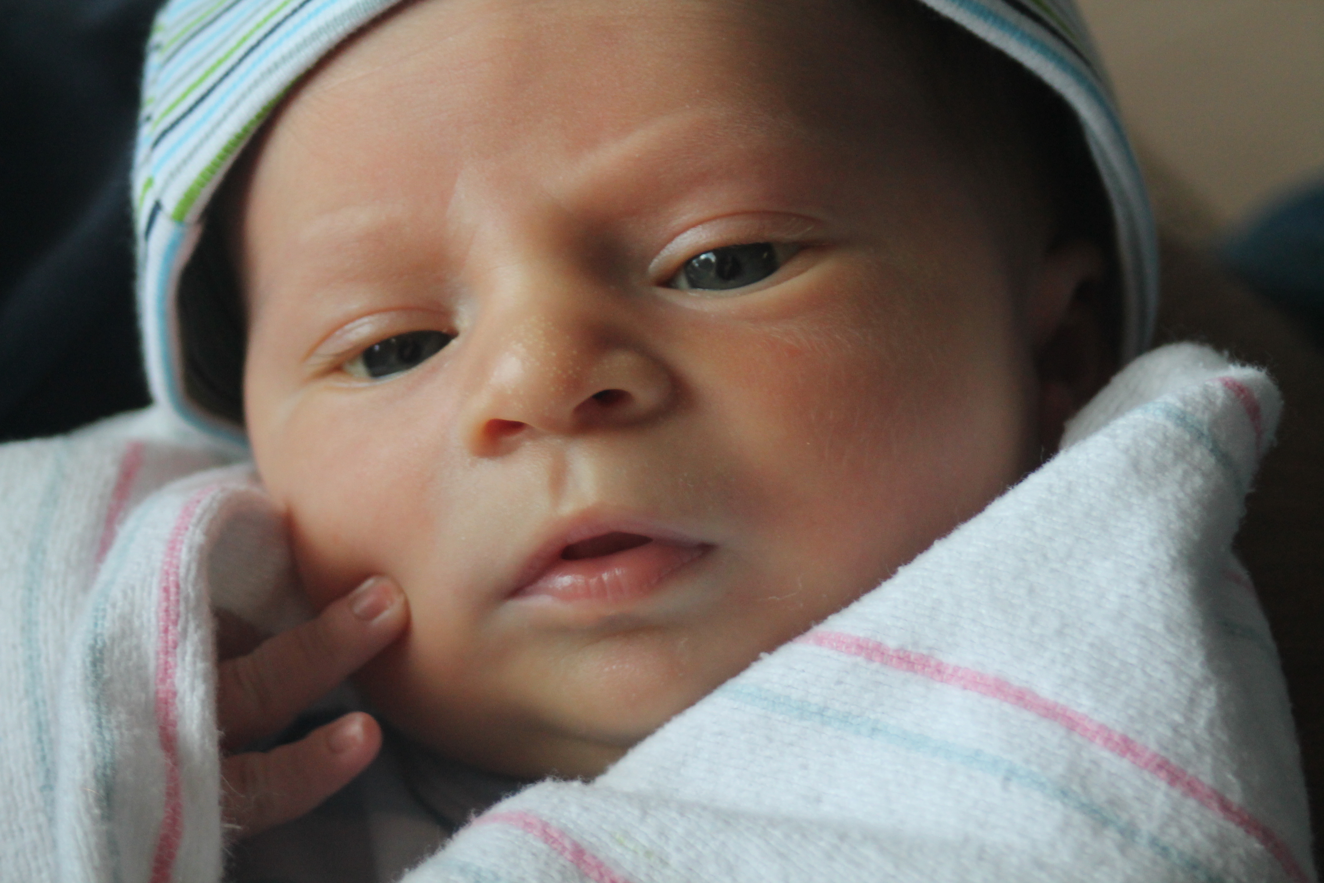 I am very late in posting this, but am just now learning to tread water. Our son had an eviction date of July 30 at 6am. I guess he didn't like being told what to do, so he decided to have my water break and get the show started at 245 am that same day. Thankfully, since I was scheduled to be induced, his dad had come home that night and was able to take me to the hospital while I was contracting every 2 minutes around 330 am. We thought he was going to be here by lunch time, but unfortunately, that didn't happen. I was at 9 cm for about 10 hours. Once I got to 10 cm, the doctor came in, found out the problem, turned him 180 degrees in my belly (which felt really weird), and the prize for surviving 20 hours and 7 minutes of labor was my beautiful baby boy. I couldn't stop smiling, and was amazed at how alert this little guy was. I truly believe birth is a miracle and every child is a gift. Thank you ladies for all of your support through this pregnancy. I hope the pic isn't too big!