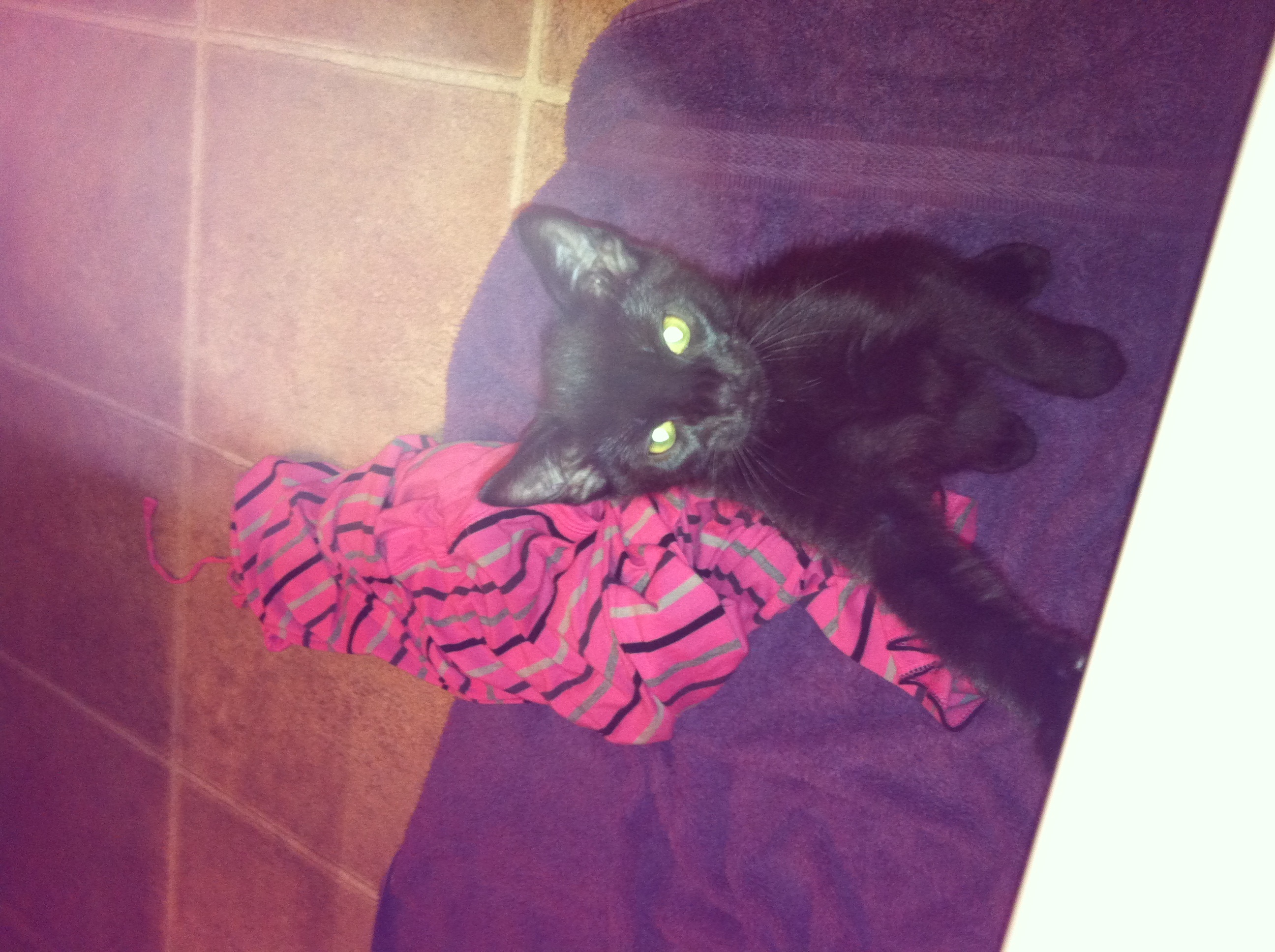 I'm cat sitting for a week. Here is the new addition causin mayhem in my house. Little lady is sticking up for herself among the older biatches. It's pretty hilarious to watch her charge up to my cats and wait for them to hiss. She then just sashayes away. Not sure why this is upside down. Mobile? ETA: like my laundry in the background?