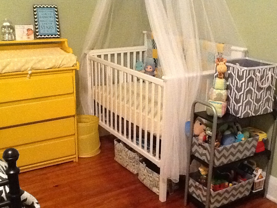 We are moving when baby boy is 4 months old, that fact coupled with the memory of barely using DD1's or DD2's nursery for the first year encouraged us to leave the third bedroom as a den (my girls share a room already) and just make baby boy a corner in our room. We went with the popular grey with pops of yellow and teal color scheme with mixed patterns. We plan for his eventual room to have light grey walls with an accent wall painted white and grey stripes. I still need a few more touches, possibly a rug too, but this is basically it!