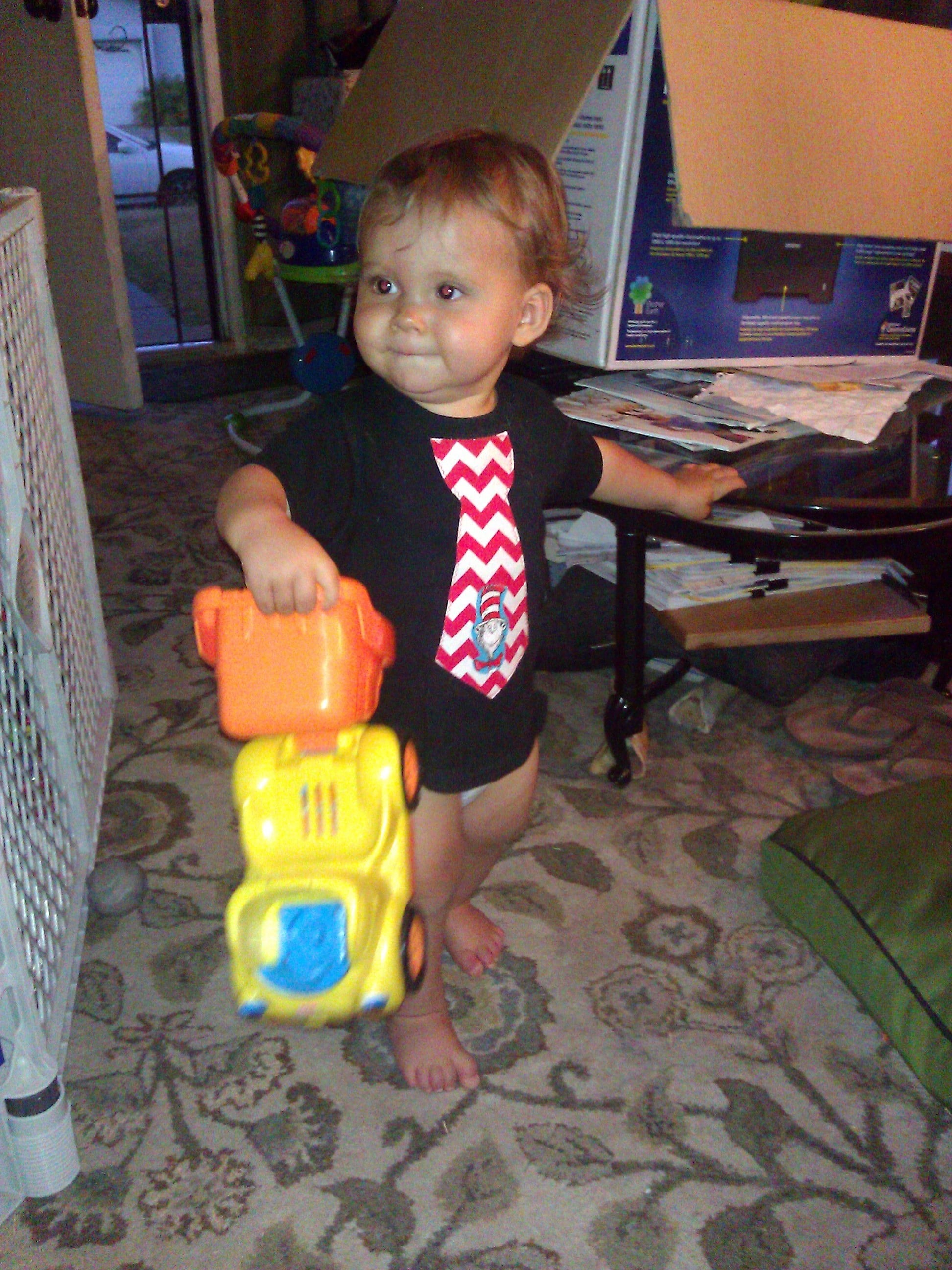 We had his birthday party at a park, it was Dr. Seuss themed and we had a lot of fun. I made deviled eggs with avocado for the "green eggs" and some ham rolls (cream cheese, black olive and green onion wrapped up in ham slices) and both were a hit! The pic in this post is of Rowan playing with a toy after the party, in his Dr. Seuss shirt. He had red shorts to go with it.