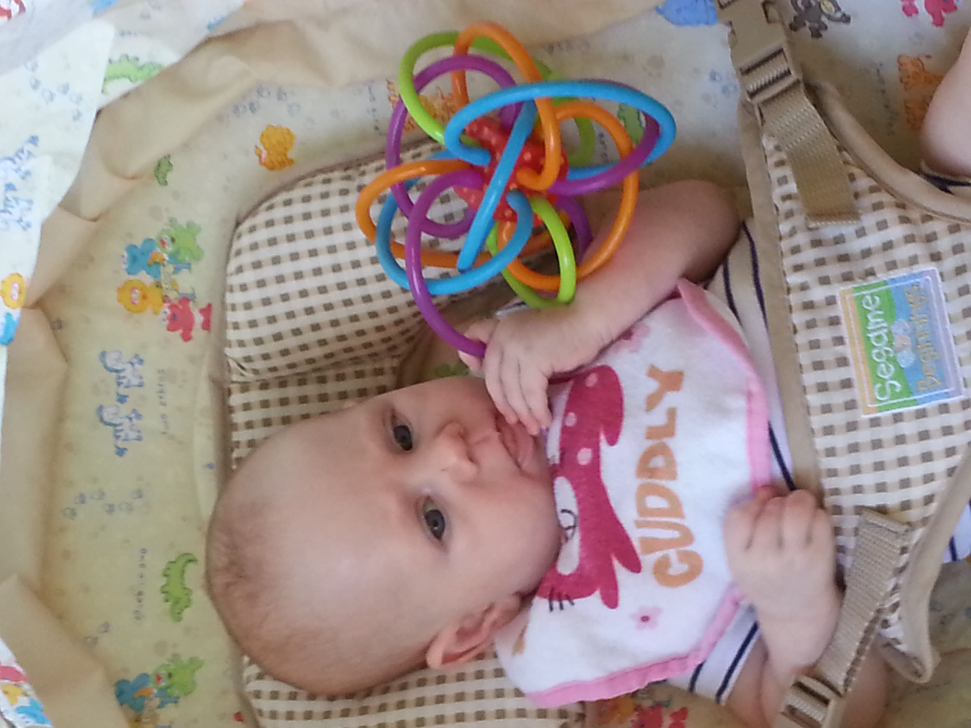 We have this. Got it at TJ Maxx for like $7.99. He seems to like it now that he can sit up for a few minutes. He LOVES his oball rattle. And likes to chew on his burp cloth, too lol. We have the baby Einstein jumpy thing (our's wasn't recalled) and he does well in that for about 30 minutes at a time a few times a day.